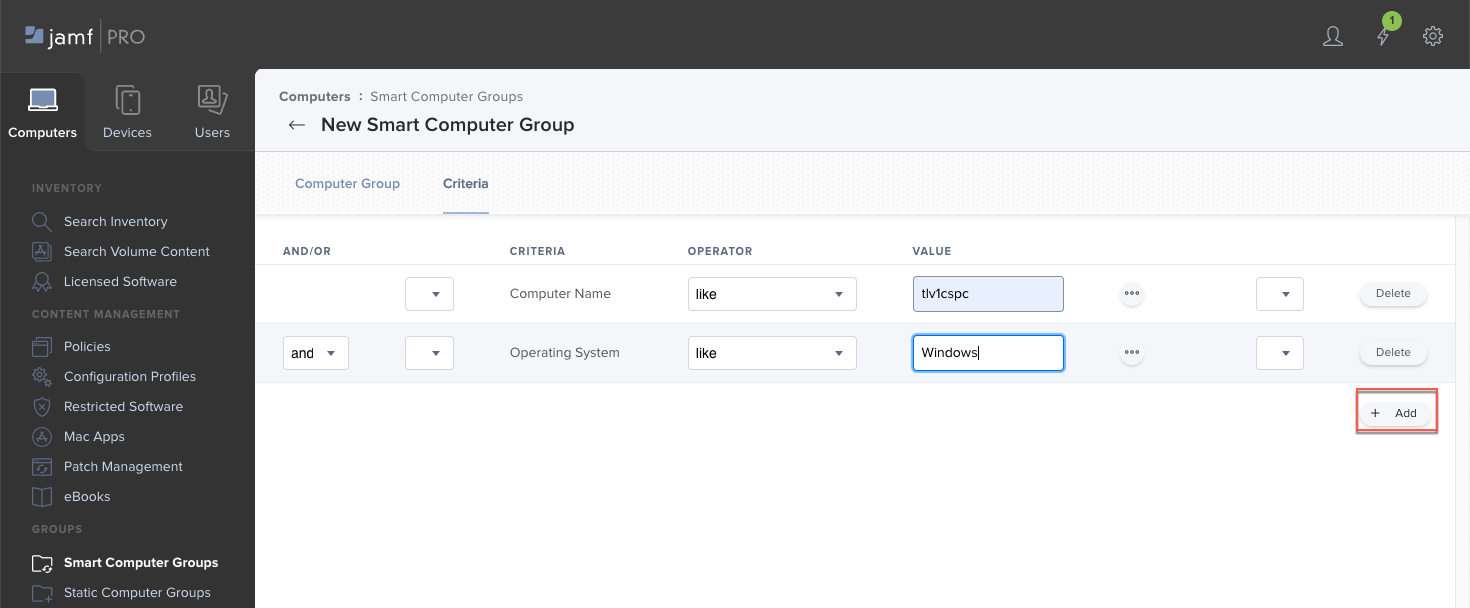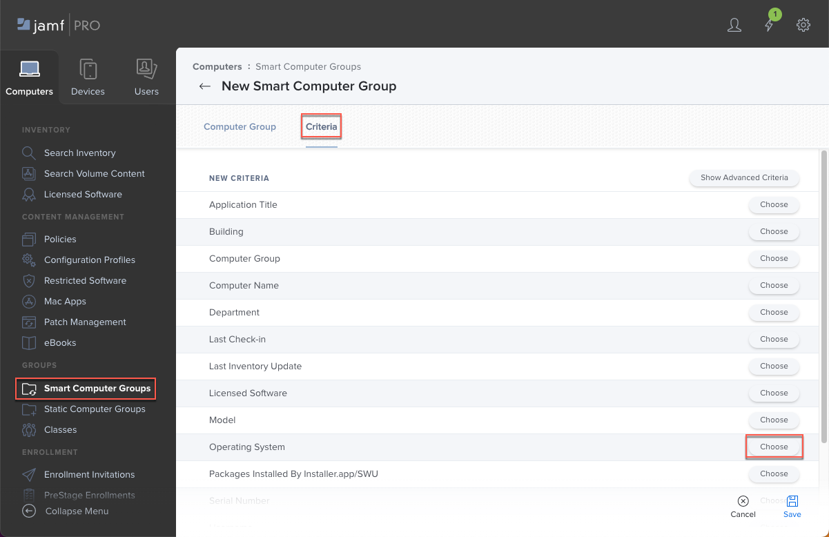- In Jamf Pro, select ComputersSmart Computer GroupsNew.Enter a Display Name for the group.Select Criteria and Add a criteria for the group.Choose a criteria from the list.