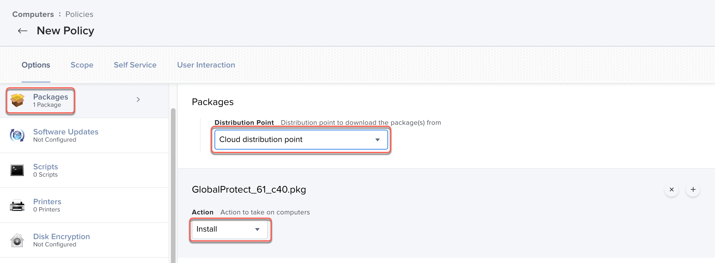 7. Create a Jamf Policy by adding the GlobalProtect package and script to the policy, and setting the scope to the Smart Computer Group that you created for your macOS devices in step 6.