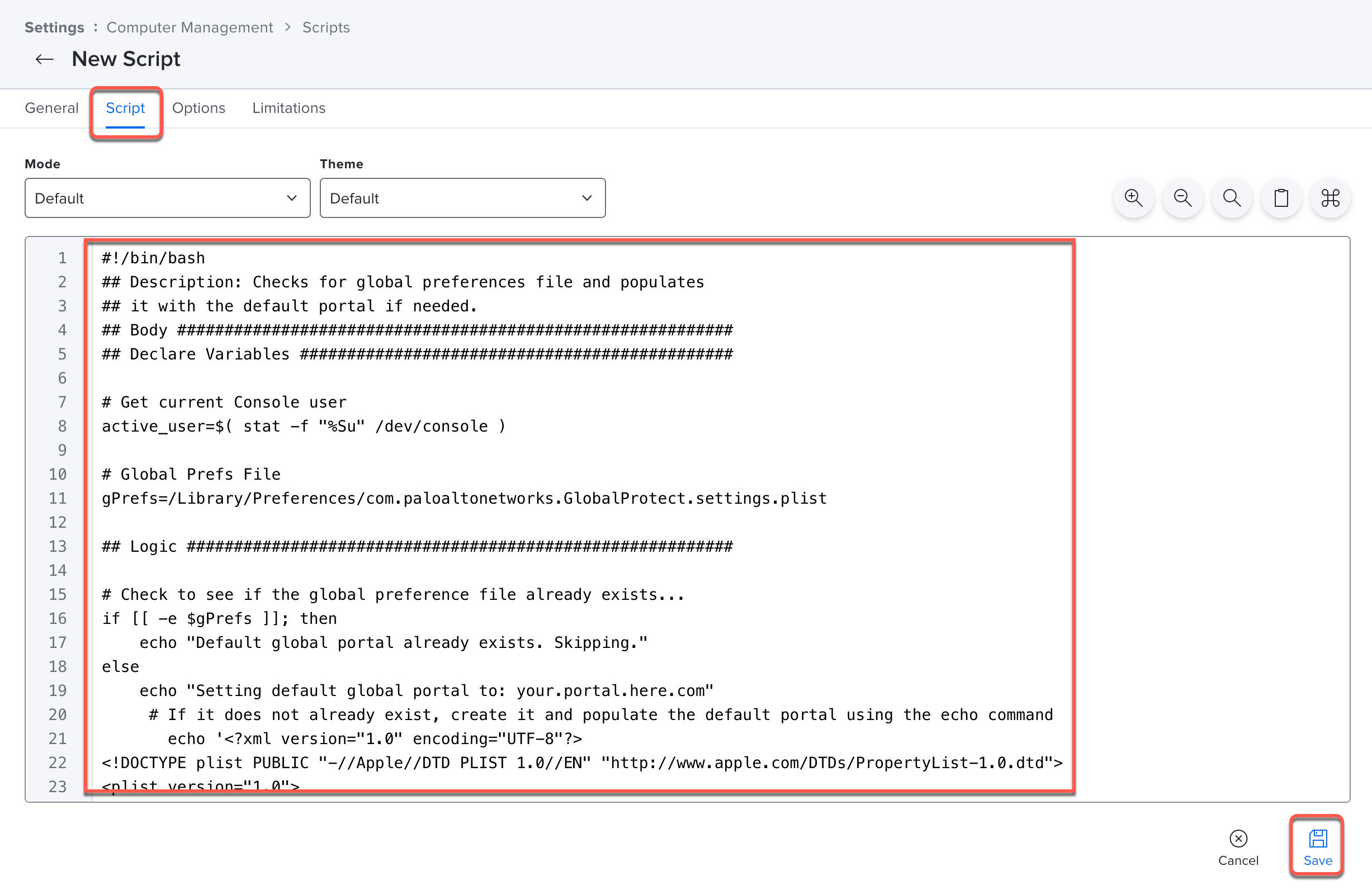 3. Create a script that you will add to Jamf Pro that prepopulates default settings, such as the default GlobalProtect portal and connection method. You can also set up the script to support multiple GlobalProtect portals.