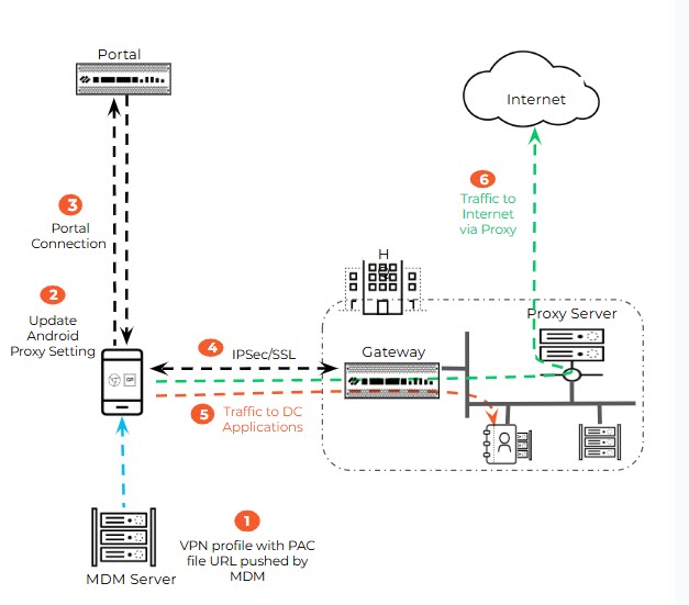 Proxy Auto Configuration (PAC) Deployment from GlobalProtect on Android EndpointsStarting from GlobalProtect Android app version 6.1.7, you can configure and deploy proxy auto-configuration (PAC) file URLs on Android endpoints, using the mobile device management (MDM) platforms. By pushing these configurations through mobile device management (MDM), the proxy settings are uniformly applied across all android endpoints, ensuring seamless deployment and consistent security measures.You can add the PAC file URL using the following values while creating an app configuration policy rule on Android endpoints using MDM platforms.Key: proxy-urlValue Type: <String>, for example,http://pac./proxy.pac,https://pac./proxy.pacThis feature extends the existing desktop capability of GlobalProtect to configure third-party proxies through proxy auto-configuration (PAC) file URLs to the Android mobile platform as well and it eliminates the need of other third- party tools for PAC file URL deployment.The supported PAC file URL method includes the Proxy Auto-configuration (PAC) standard and the feature is supported on Android version 11 and later.
