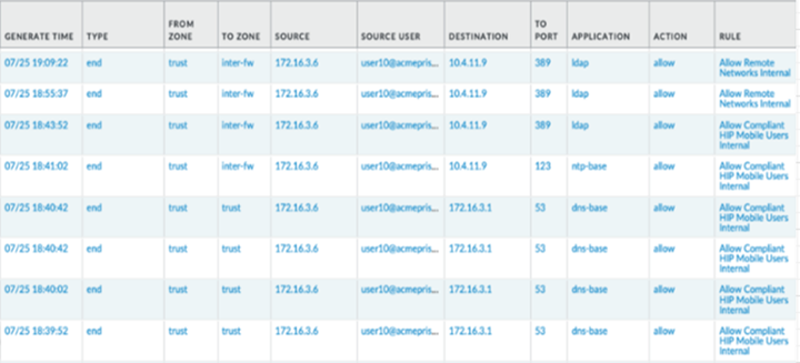 Review the traffic logs to ensure that the device is hitting the security policy you have configured for your GlobalProtect users. For example, in the logs below we can see that user10@acmeprismaaccess.com is hitting the rule that allows mobile users that pass the HIP check can access the internal network.