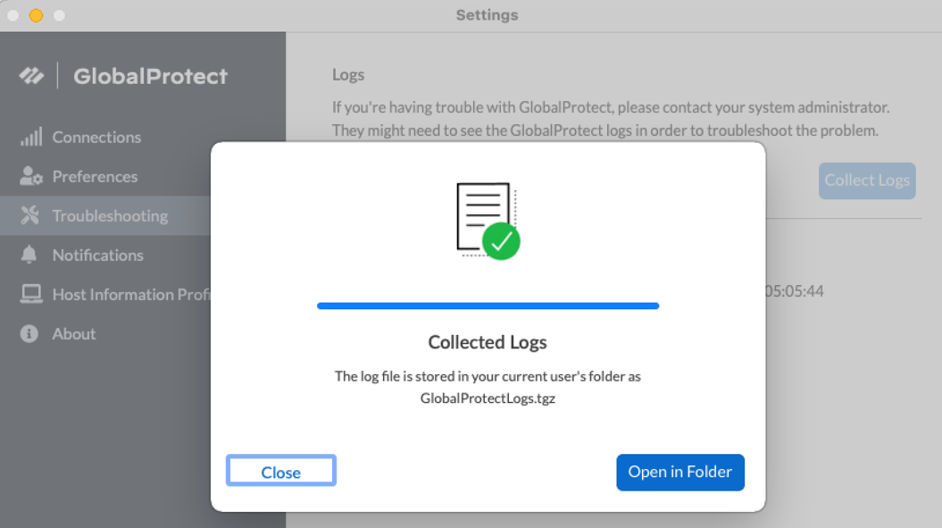 (Optional) Collect Logs to send to your GlobalProtect administrator for troubleshooting.