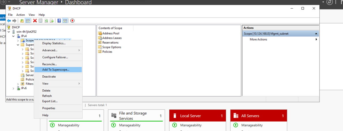 15. The new scope of IP addresses is added under IPv4. Right-click on the new scope and select Add to SuperScope.