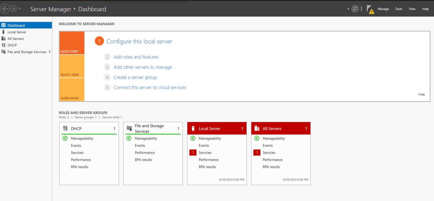 2. On the Microsoft Server Manager Dashboard, select Add roles and features.