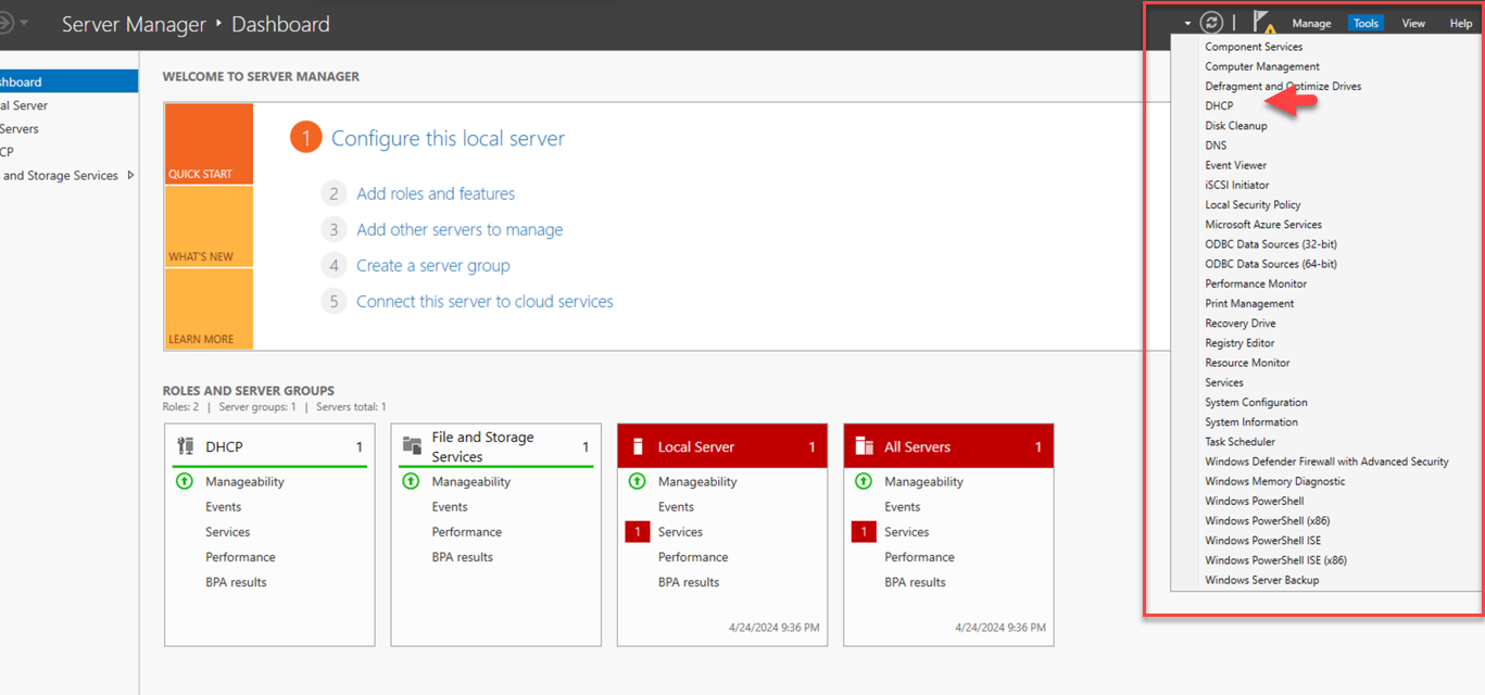 8. Click Tools and select DHCP.