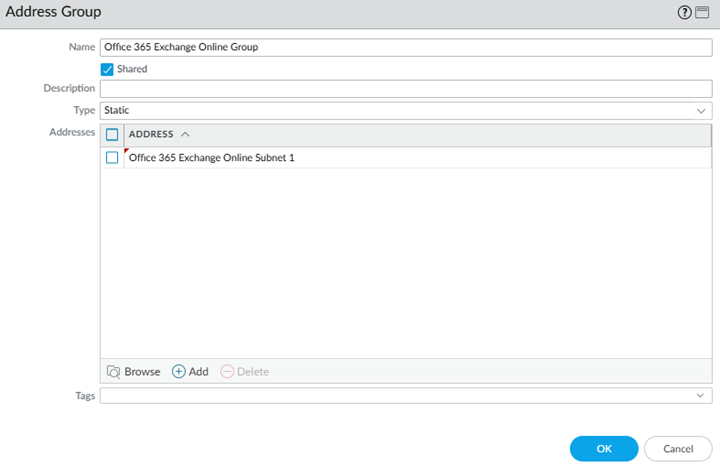 - Define the address group (for example, Office 365 Exchange Online) and add all the address objects you created in the previous step.