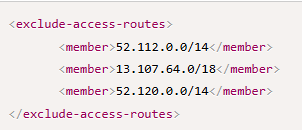 output. To configure the split tunnel using exclude routes, you need only the IP addresses from this output. You do not need the URLs or FQDNs for the recommended split tunnel configuration.