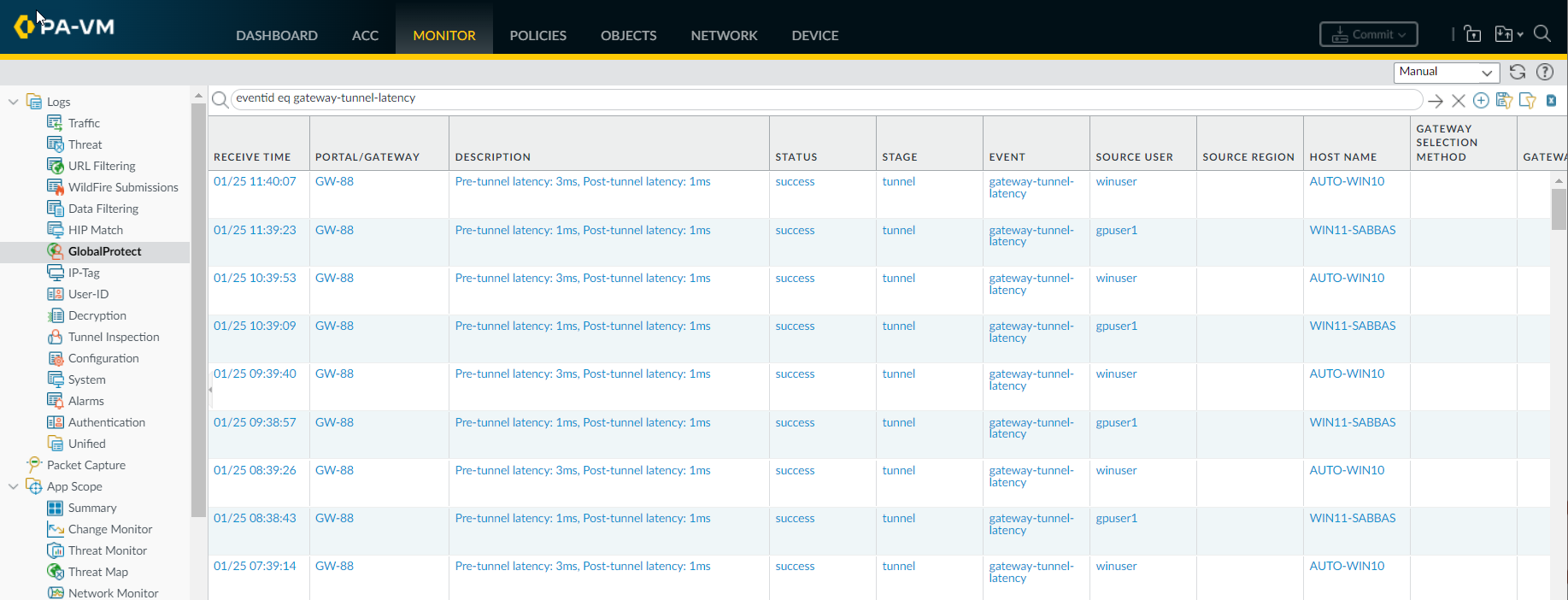In PAN-OS, filter GlobalProtect logs for gateway tunnel