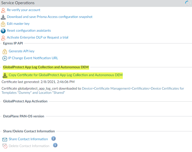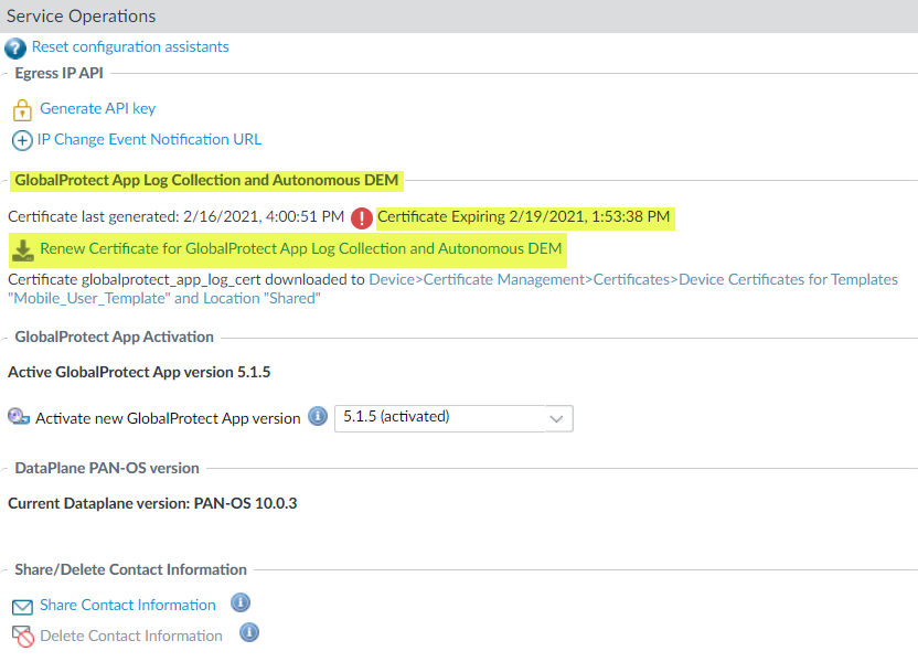 (Optional) Request a new client certificate before the certificate expires.The client certificate has a lifespan of 1 year.- In Panorama, select PanoramaCloud ServicesConfigurationTenantsSelect the tenant you created from the Tenant drop-down.Select PanoramaCloud ServicesConfigurationService Setup.Select Renew Certificate for GlobalProtect App Log Collection and Autonomous DEM.