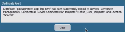 - For Prisma Access deployments, click Yes to generate a client certificate.If you configure Prisma Access to manage a single tenant, the globalprotect_app_log_cert certificate is automatically imported to the Mobile_User_Template and the Shared location.If you configure Prisma Access to manage multiple tenants, the globalprotect_app_log_cert certificate is automatically imported to the second mobile user template after the first and named mu-tpl-tenant. The globalprotect_app_log_cert certificate is imported to the additional tenants.After the globalprotect_app_log_cert certificate has been generated and downloaded to DeviceCertificate ManagementCertificates, you receive a success message. The Mobile_User_Template is selected automatically as the Template and Shared is selected automatically as the Location.