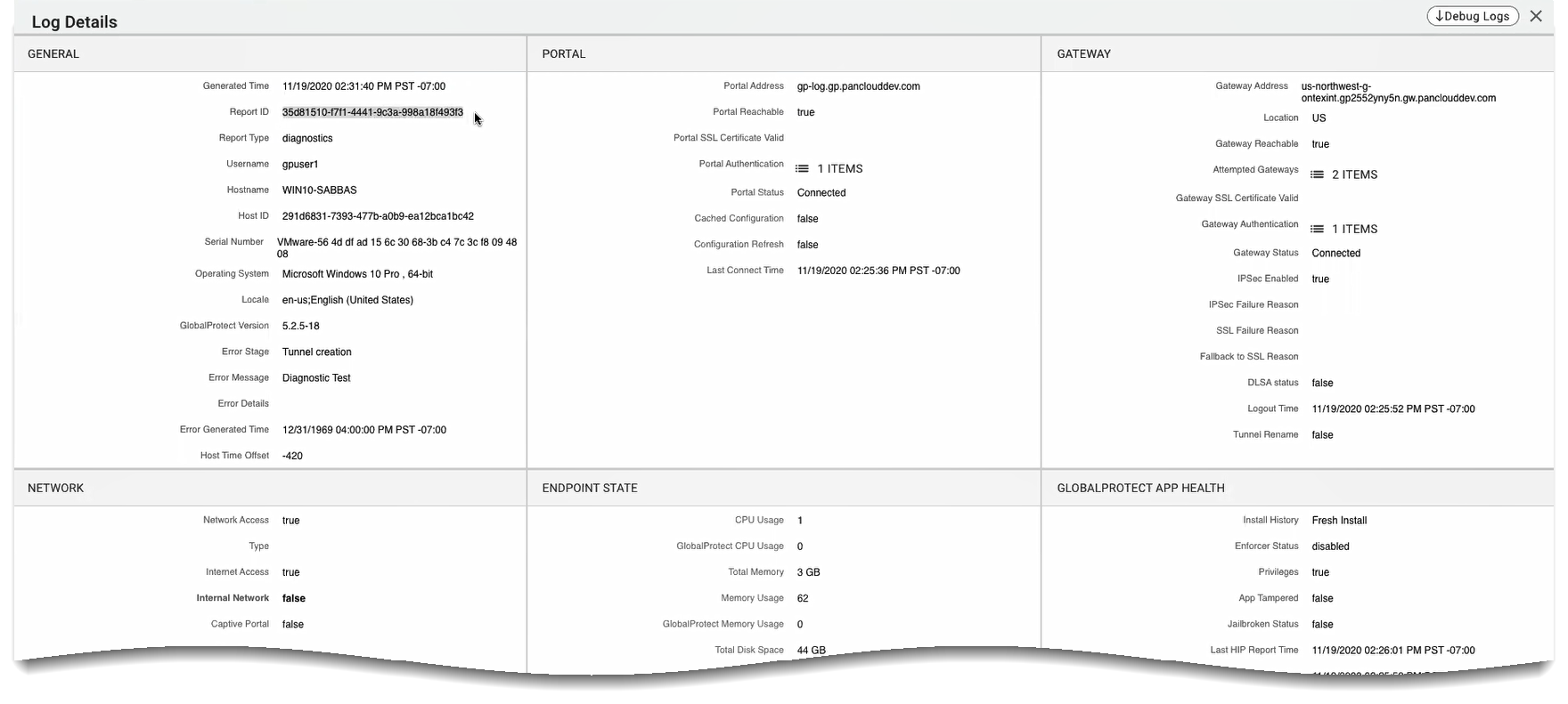 Verify the entire troubleshooting and diagnostics log record in the Log Details window. The log record may only include troubleshooting information or diagnostic log based on user consent.The individual log fields are placed into logical groupings. If you did not enable the app to run diagnostic tests and to include diagnostic logs, the log fields for the Endpoint State, GlobalProtect App Health, Gateway Network Impairments, and App Access Performance groups are empty.(Optional) If end users have consented to run diagnostic tests on the GlobalProtect app, click Debug Logs to download the GlobalProtect debug log files to your desktop for further analysis.You can unzip the GlobalProtect debug log files from the reportid_GlobalProtectLogs.zip zip package. You can enter the reportid search criteria in the Search field to quickly find reportid_GlobalProtectLogs.zip zip package.