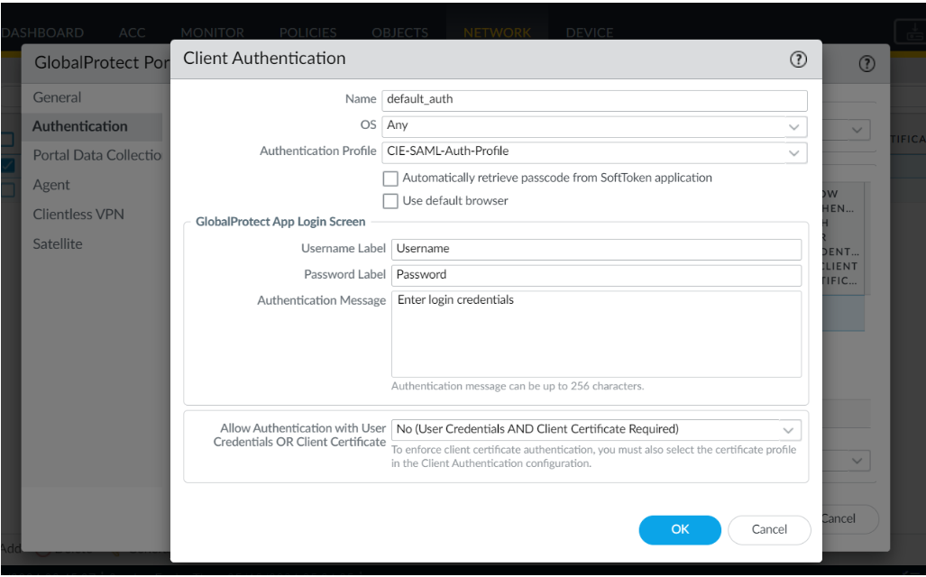 - Select NetworkGlobalProtectPortals<portal-config>Authentication<client-authentication-config> .