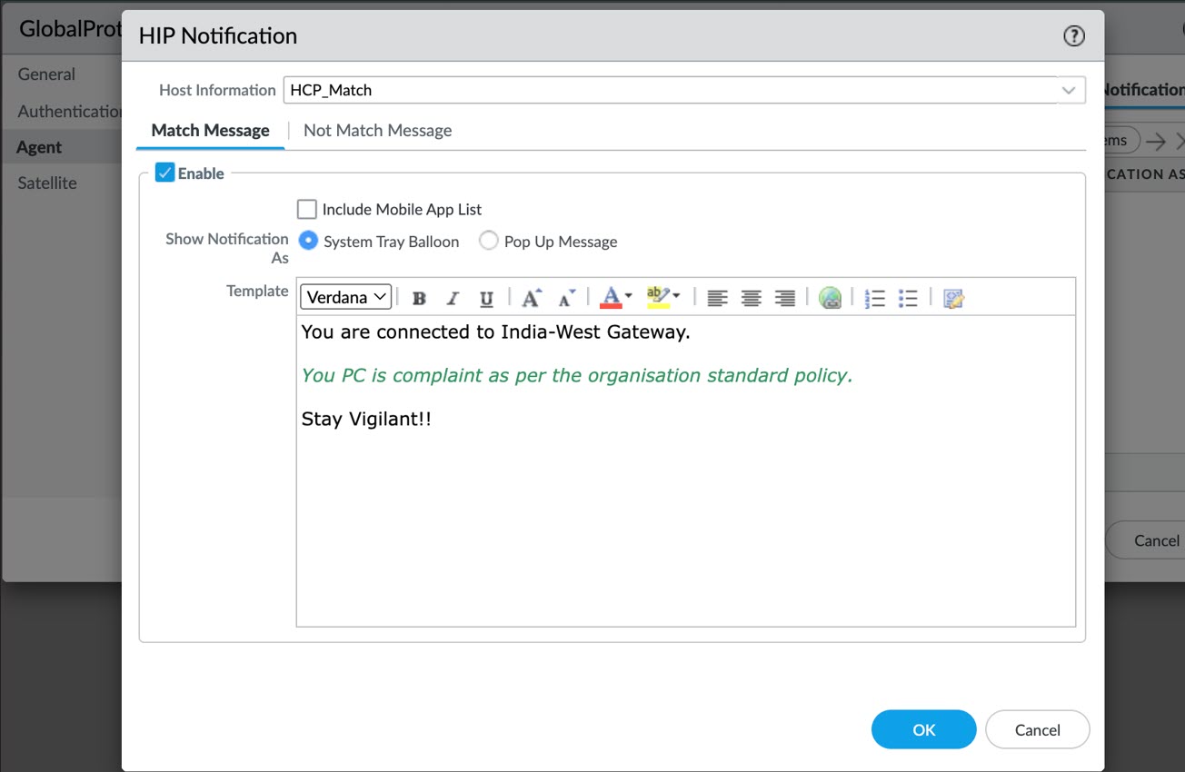 Depending on whether you want to display the message when the corresponding HCP is matched or not matched, select Match Message or Not Match Message. In some cases, you might want to create messages for both a match and a non-match, depending on what objects you are matching and what your objectives are for the security policy.Enable the Match Message or Not Match Message, and then select whether you want to display the message as a Pop Up Message or a System Tray Balloon.Enter your message text in the Template text box, and then click OK.