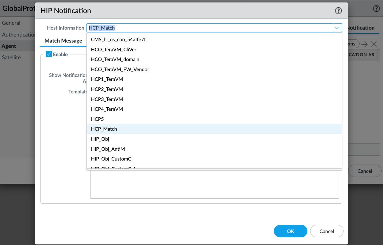 - On the firewall hosting your GlobalProtect gateway(s), select NetworkGlobalProtectGateways.Select the gateway configuration for which you want to add HIP notification messages.Select AgentHIP Notification, and then click Add.Select the HCP to which this message applies from the Host Information drop-down.
