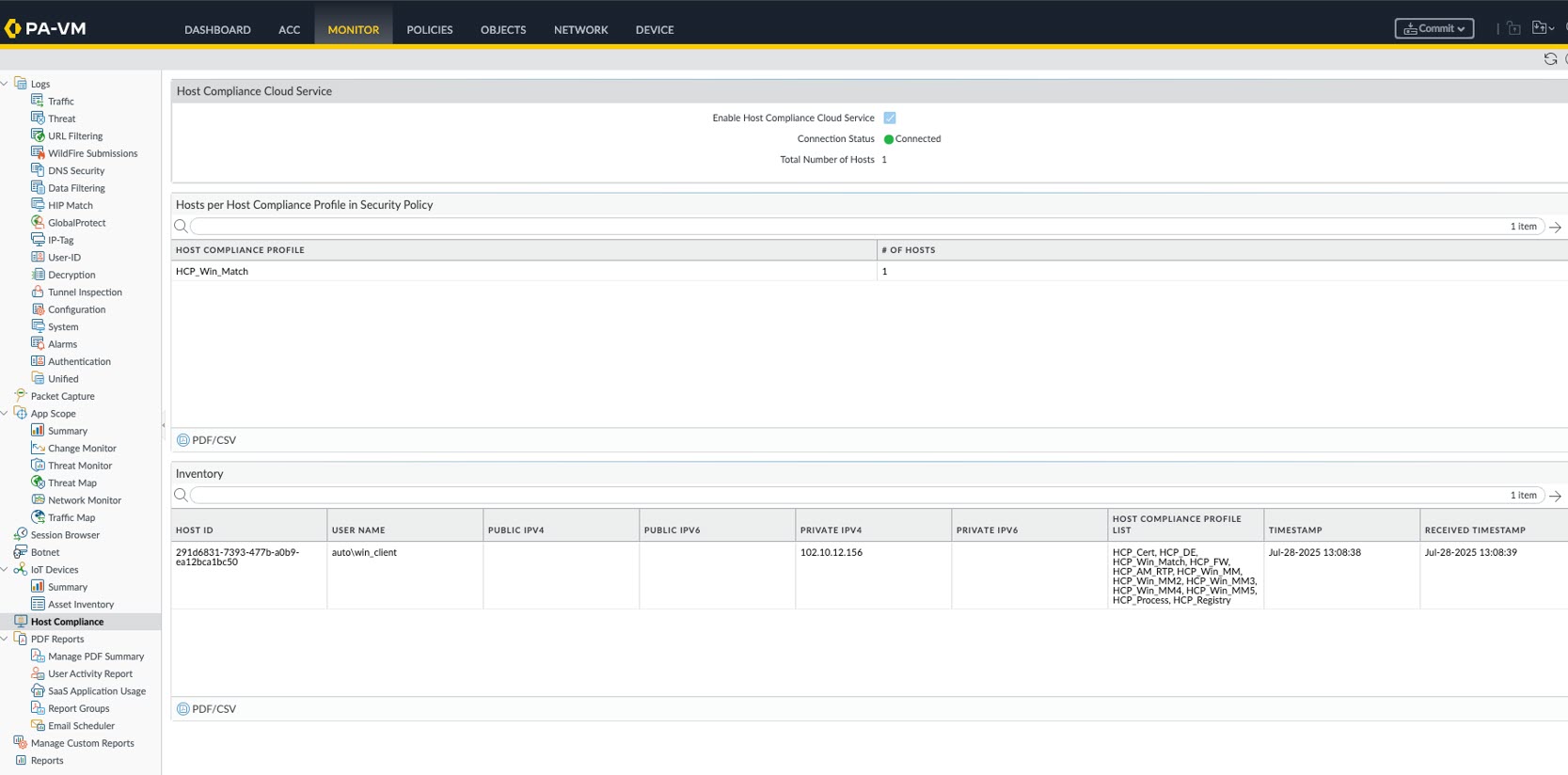 2. To view the details, on the firewall that is hosting your gateway, select MonitorHost Compliance.