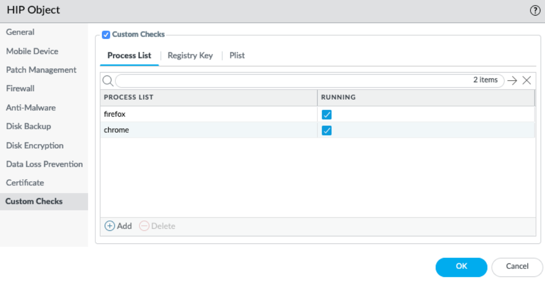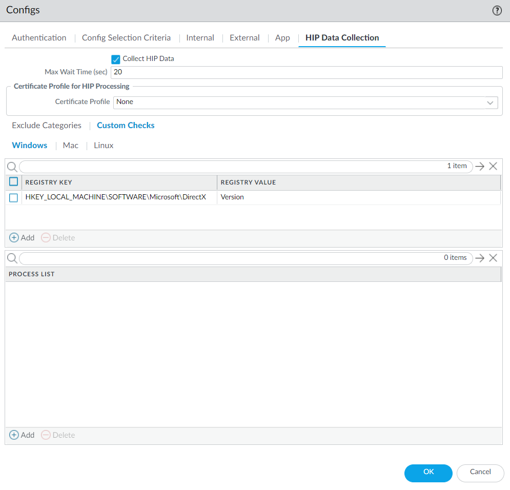 (Optional) Check if a specific process is running on the endpoint.- On the Panorama, select NetworkGlobalProtectPortals.Select an existing portal configuration or Add a new one.On the Agent tab, select the agent configuration that you want to modify or Add a new one.Select HIP Data Collection.Enable the GlobalProtect app to Collect HIP DataSelect Custom ChecksWindows, Mac, or Linux.Add the name of the process that you want to collect information about to the Process List.Save the custom check.Click OK and Commit the changes.(Optional) Create a HIP Object to match to a Registry Key (Windows), plist (macOS), or process list (Linux), which allows you to filter the raw host information collected from the GlobalProtect app to monitor the data for the custom check.With a HIP object defined for the custom check data, the gateway matches the raw data submitted from the app to the HIP object, and a HIP Match log entry is generated for the data (MonitorHIP Match).For Windows, macOS, and Linux endpoints: