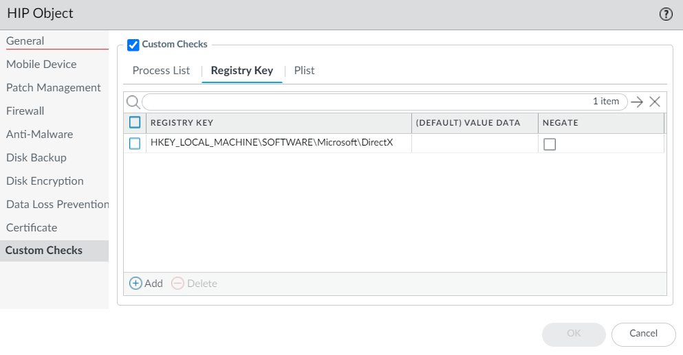Click OK to save the HIP object. You can Commit the changes to view the data in the HIP Match logs at the next device check-in or continue to step 6.For macOS endpoints only:- To check macOS endpoints for a specific plist, select Plist, and then Add the plist for which you to want to check. When prompted, enter the name of the Plist. If you want to match macOS endpoints that do not have the specified plist, enable the Plist does not exist option.To match on a specific key-value pair within a plist, select Plist, and then Add the plist for which you to want to check. When prompted, enter the name of the Plist and then Add a Key and corresponding Value to match. Alternatively, if you want to identify endpoints that do not have a specific key and value, you can select Negate after you add the Key and Value.