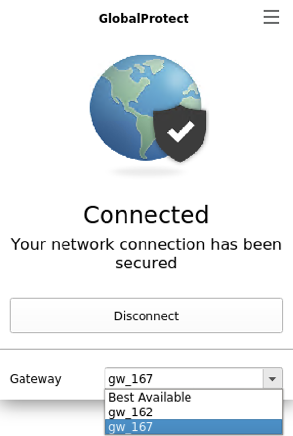 user@linuxhost:~$ globalprotect show --manual-gateway Name Address ------------------------------ gw1 192.168.1.180 gw2 192.168.1.181 user@linuxhost:~$ globalprotect connect --gateway 192.168.1.180 Retrieving configuration... Discovering network... Connecting... Connected