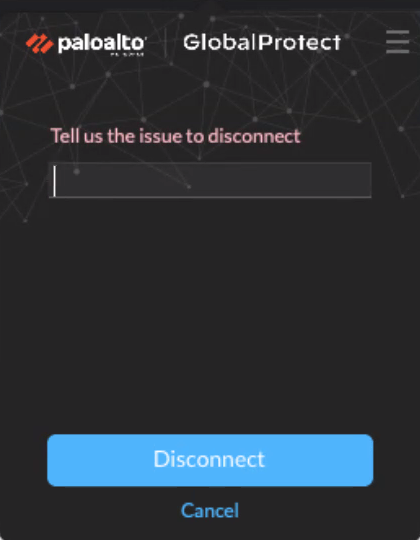 The Disconnect option is visible only if your GlobalProtect agent configuration allows you to disconnect the app. If the configuration allows you to disconnect the GlobalProtect app without requiring you to respond to a challenge, the GlobalProtect app closes without requiring further action.