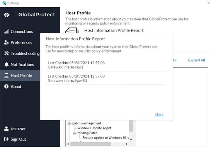 - Host Information Profile—The Host Information Profile tab displays the endpoint data that GlobalProtect uses to monitor and enforce security policies using the Host Information Profile. You can Resubmit to manually resubmit HIP data to the gateway.