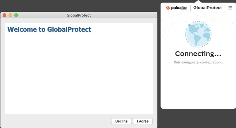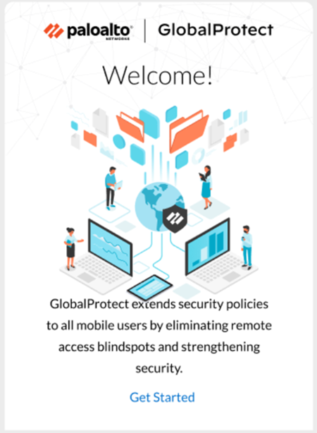 - Log in to GlobalProtect.If you are logging in to the endpoint for the first time, the GlobalProtect app displays a friendly, welcome page upon successful login. Click Get Started.