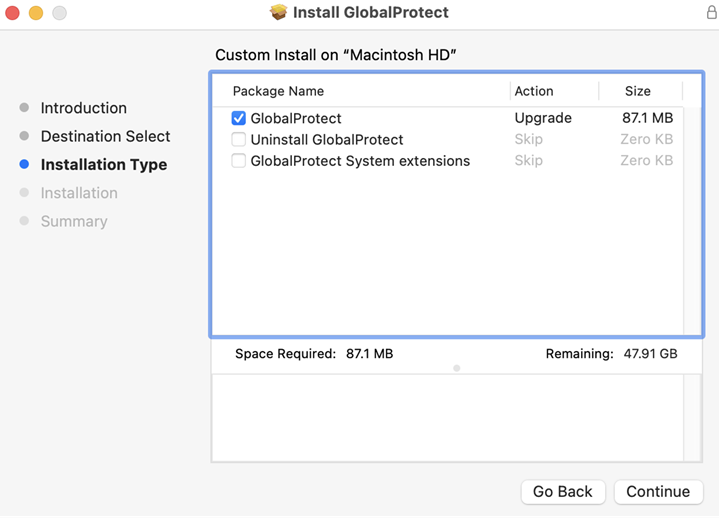On the Installation Type screen, select the GlobalProtect installation package check box.If your system administrator has configured the split tunnel on the gateway or enforced GlobalProtect connections for network access on the portal, select the GlobalProtect System extensions check box (disabled by default).Click Continue.