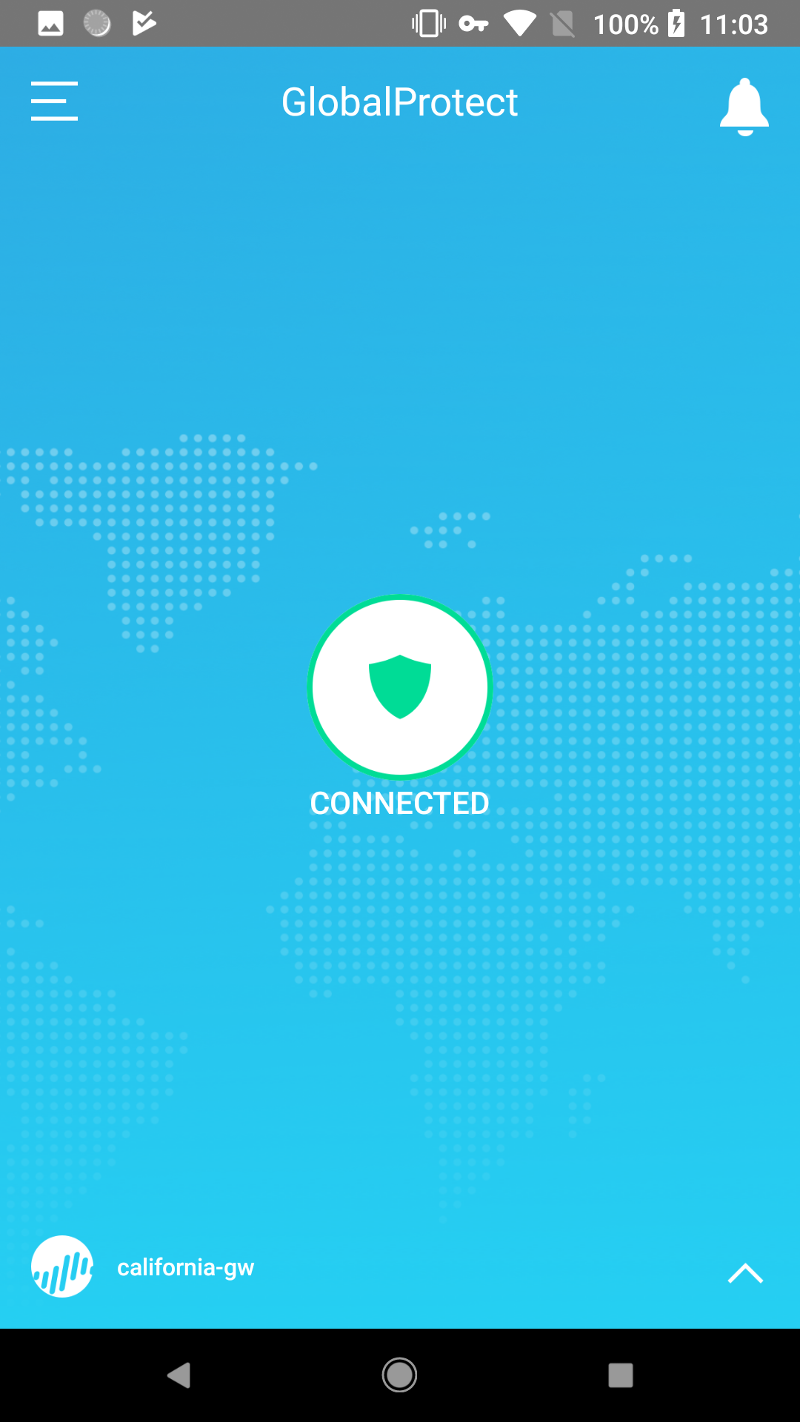 - (Optional) If your administrator has configured GlobalProtect with the Always On connect method, the connection initiates automatically. The home screen displays CONNECTED state.