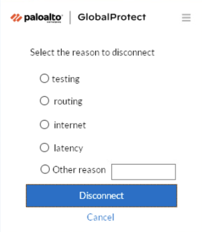 • Select the reason to disconnect—If your configuration requires you to respond to one or more reasons or enter another reason, the GlobalProtect app displays the reasons as soon as you select Disconnect.