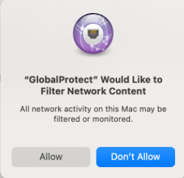 1. (macOS Catalina 10.15.4 or later and macOS Big Sur 11 or later only) If your system administrator has configured split tunnel based on domains and applications on the GlobalProtect gateway or enabled the Enforce GlobalProtect Connections for Network Access feature, select Allow in the following pop-up prompt: