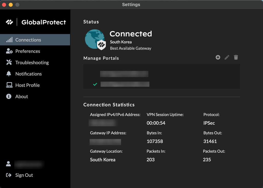 4. On the GlobalProtect Settings panel, Sign Out to clear your saved user credentials from the GlobalProtect app.