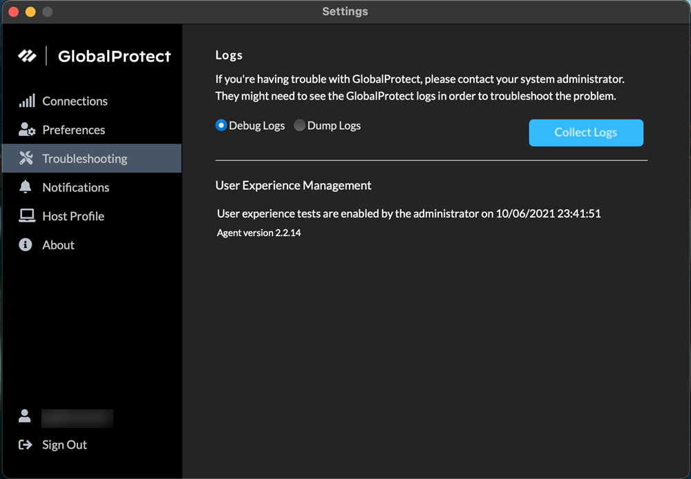 • Troubleshooting—The Troubleshooting tab allows you to Collect Logs and set the logging level to Debug Logs or Dump Logs, and optionally Enable User Experience Tests.