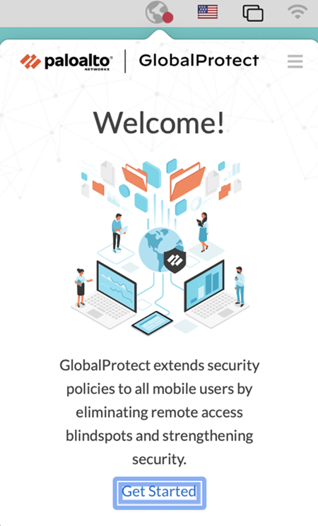 If you are logging in to the endpoint for the first time, the GlobalProtect app displays a friendly, welcome page upon successful login. Click Get Started.