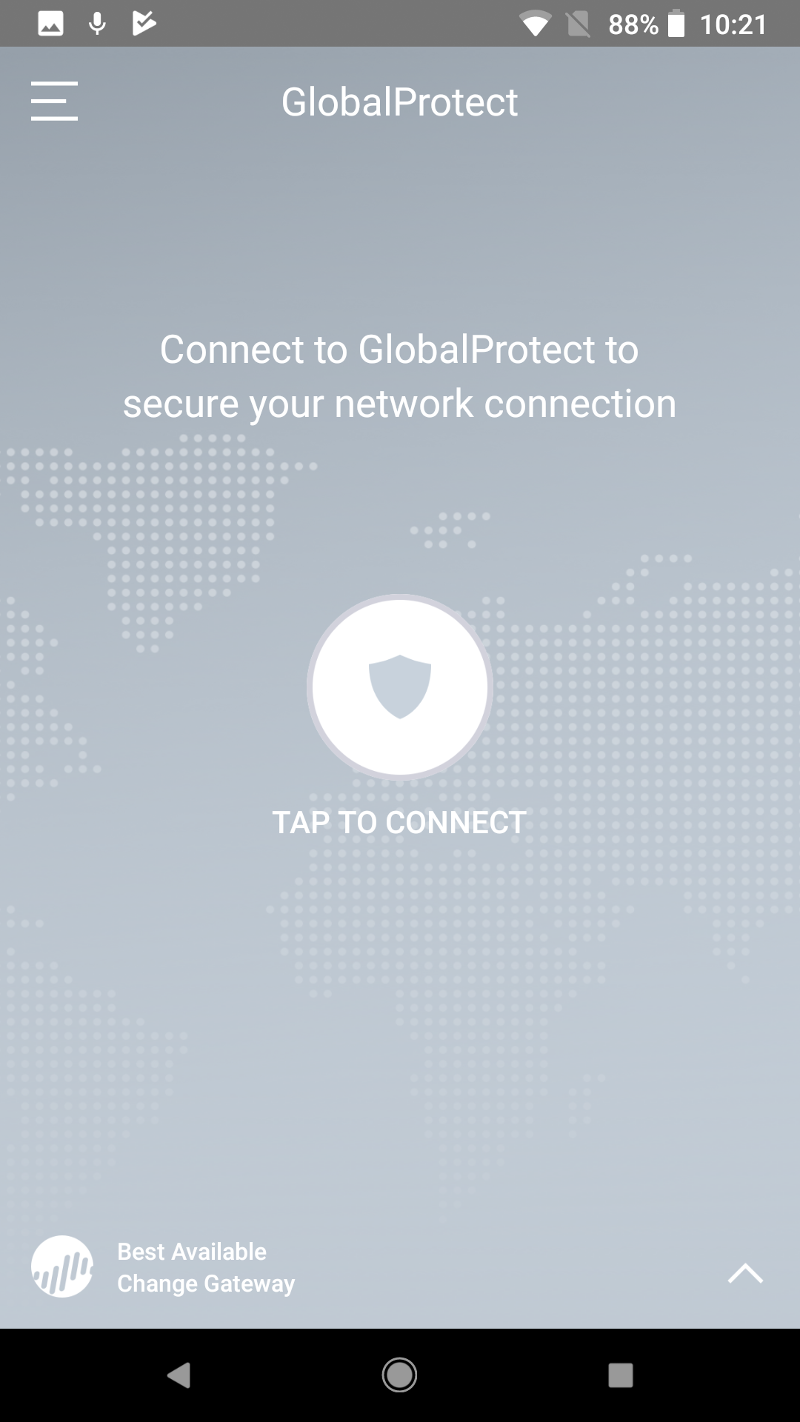 - (Optional) If your administrator has configured GlobalProtect with the Always On connect method, the connection initiates automatically. The home screen displays CONNECTED state.