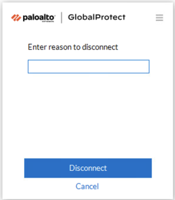 • Select the reason to disconnect—If your configuration requires you to respond to one or more reasons or enter another reason, the GlobalProtect app displays the reasons as soon as you select Disconnect.