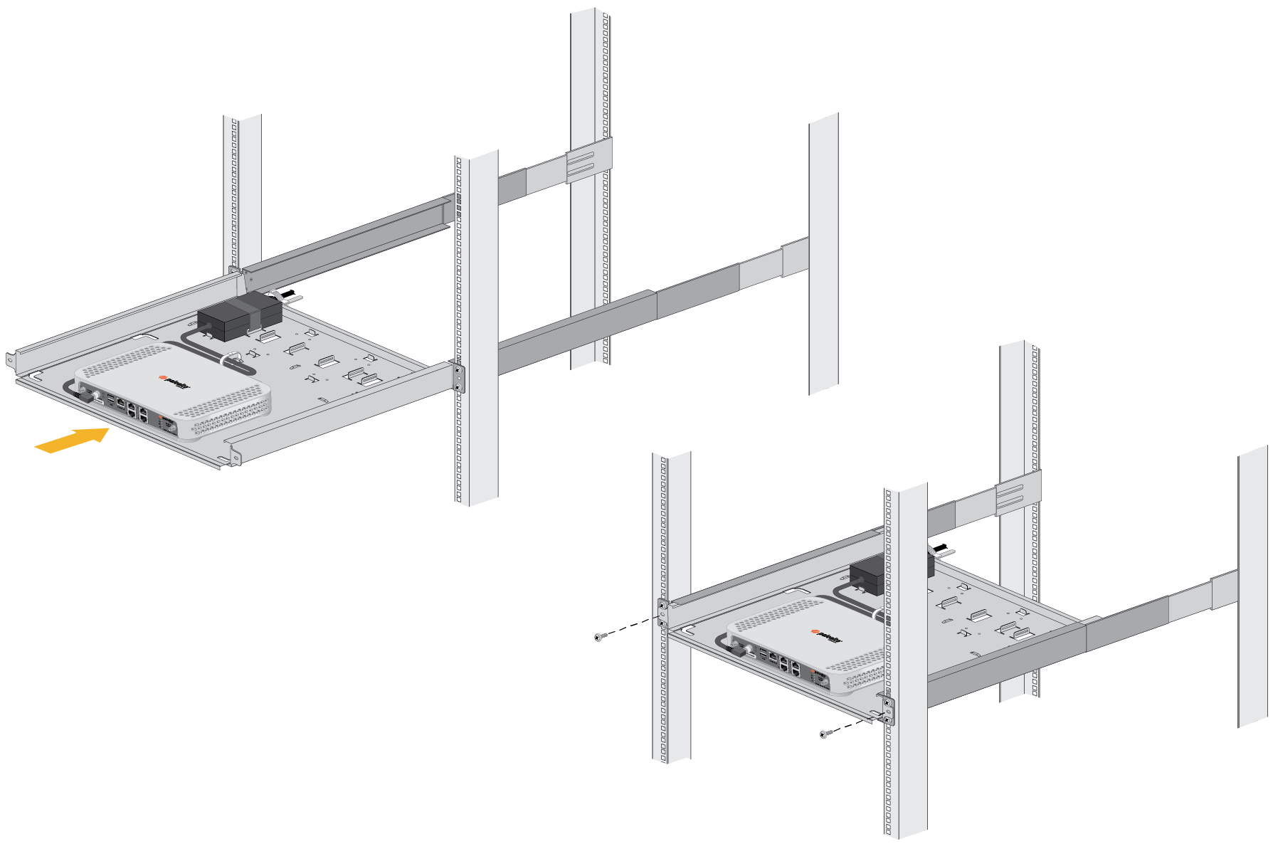 8. Slide the mounting tray into the rails previously fixed to the equipment rack. Stop when the front flange on the mounting tray is flush with the front of the rail.