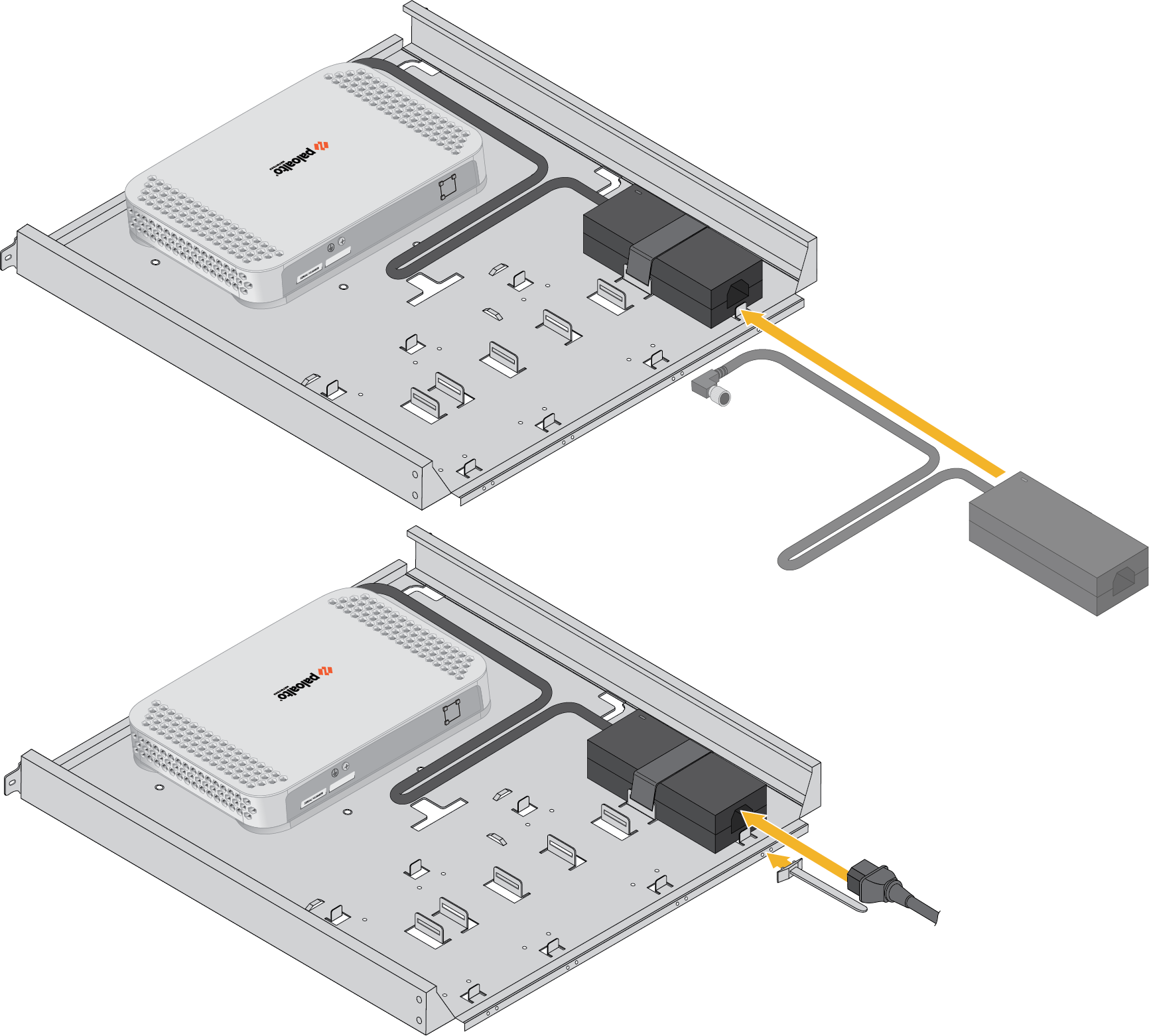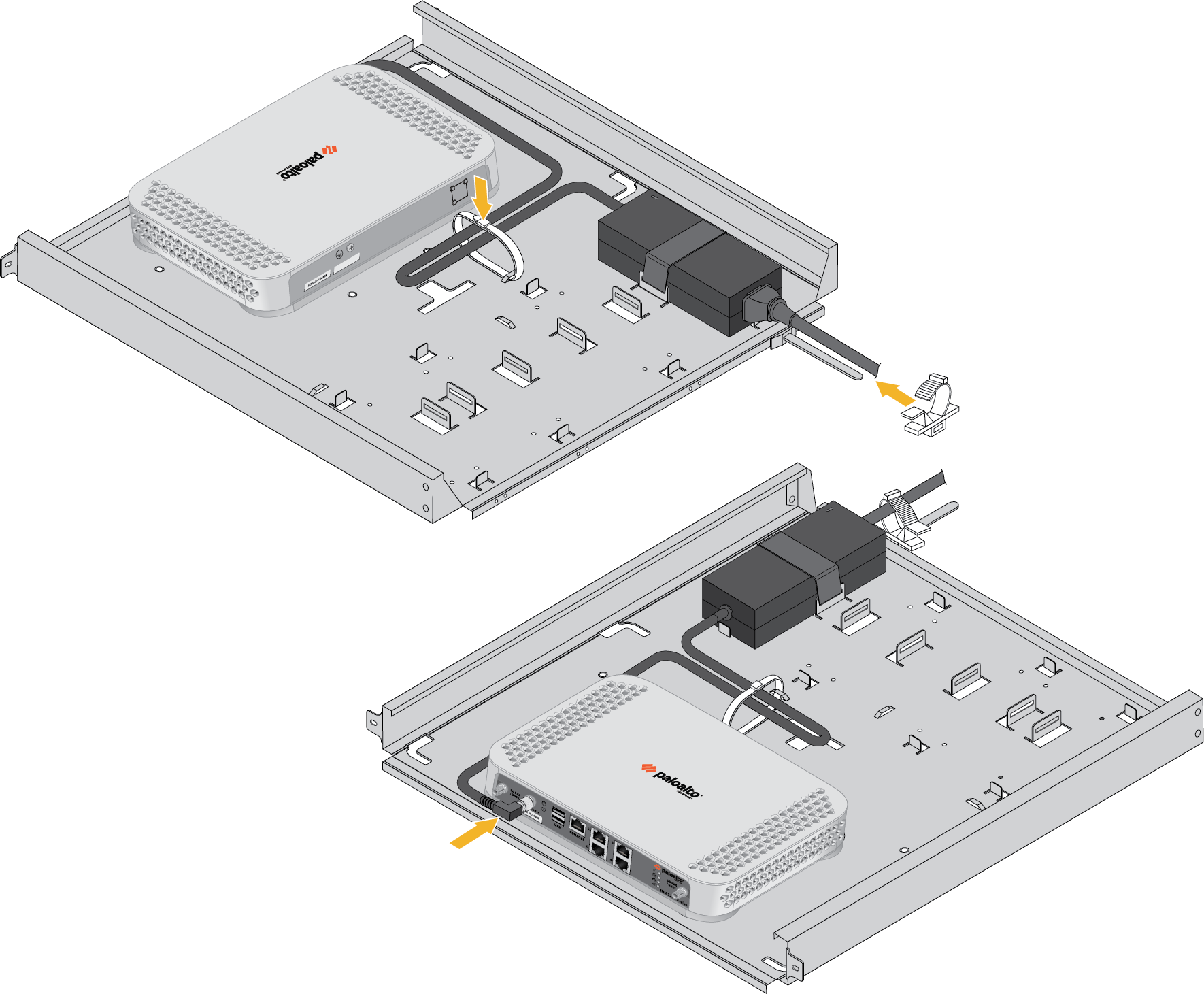 7. Plug the power supply connector into the back of the device. Using the provided tie-wraps, bind and secure the power supply cable to the metal hooks in the mounting tray.