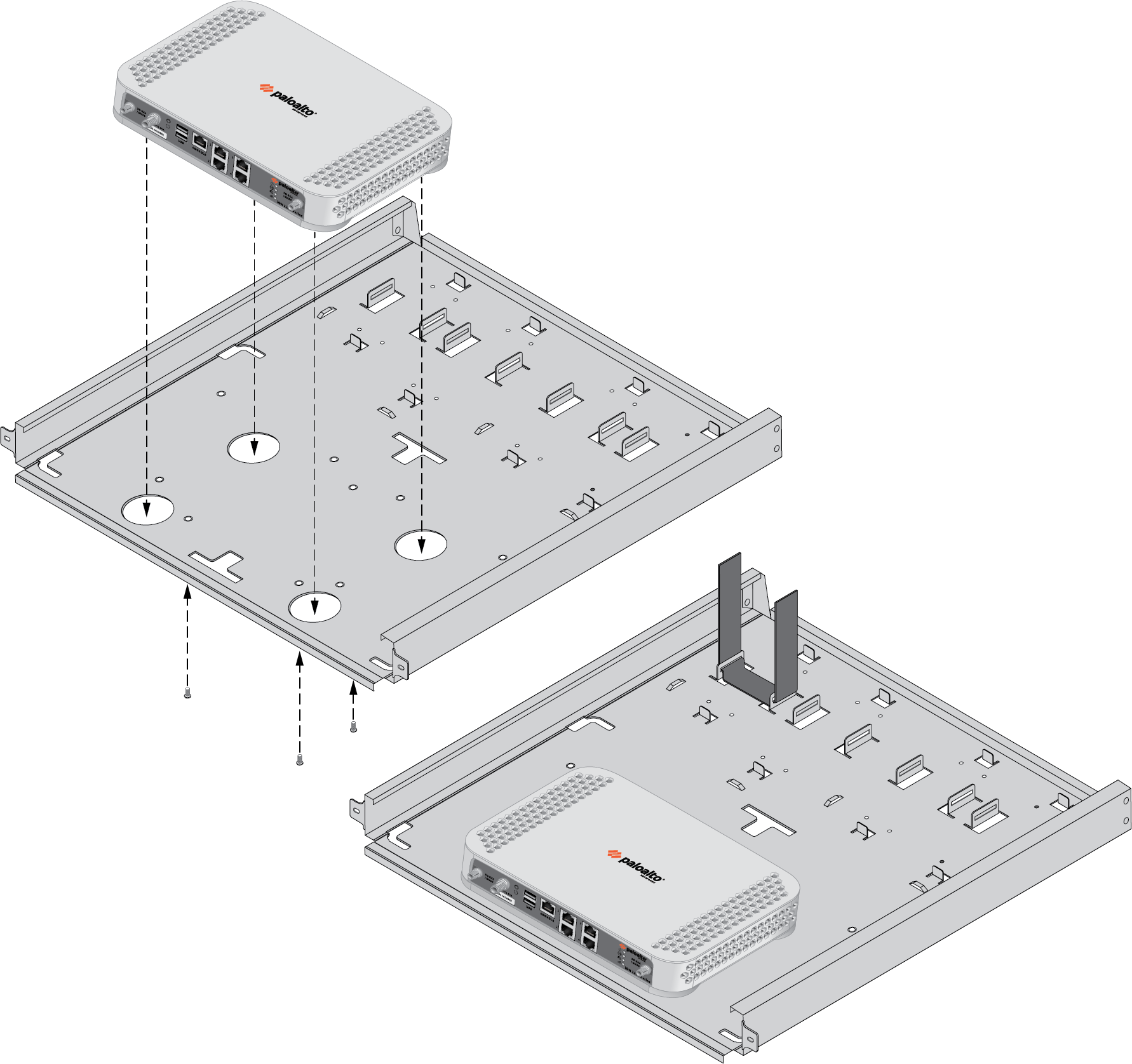 4. With the front of the device facing forward, align the four rubber feet on the bottom of the device to the slotted holes in the provided mounting tray.