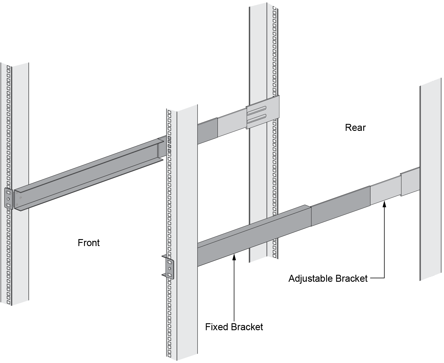 1. Slide one of the adjustable mounting brackets into one of the fixed mounting brackets to create a mounting rail. Repeat for the second mounting rail. The adjustable and fixed brackets are the same for the left and right side.