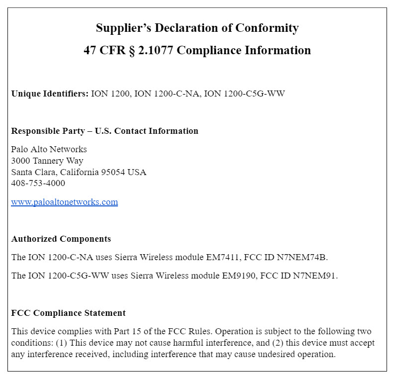 - Electromagnetic Compatibility DirectiveThe ION 1200 (without radio) complies with the requirements set out in the Electromagnetic Compatibility Directive (2014/30/EU) and the Low Voltage Directive 2014/35/EU. The full text of the EU declaration of conformity for ION 1200 is available at the following link:The ION 1200-C-ROW and ION 1200-C5G-WW (with radio) comply with the requirements set out in the Radio Equipment Directive (2014/53/EU). The full text of the EU declaration of conformity for each model is available at the following links: