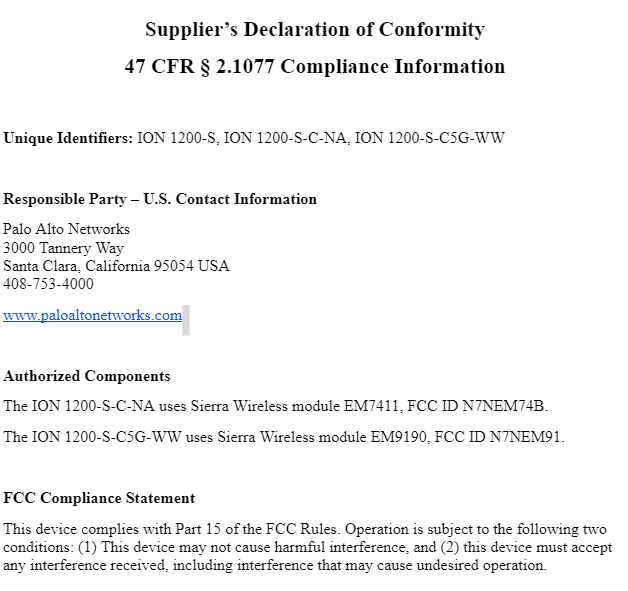 - ION 1200-S-C5G-WW is in conformity with the designated standards and fulfills the requirements of the Electrical Equipment (Safety) Regulations 2016, Electromagnetic Compatibility Regulations 2016, Radio Equipment Regulations 2017, and The Restriction of the Use of Certain Hazardous Substances in Electrical and Electronic Equipment Regulations 2012. The full text of the UK declaration of conformity for the model is available at the following link: