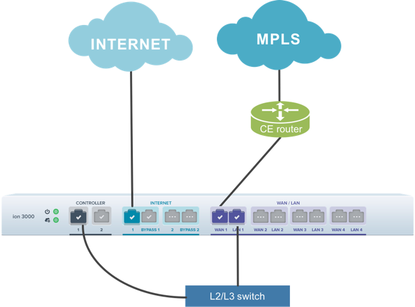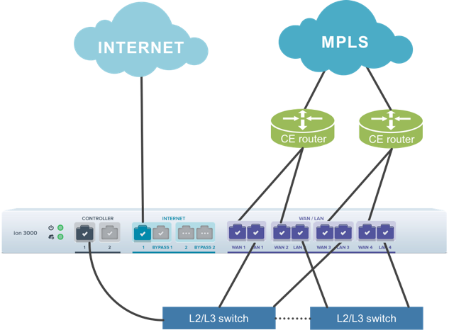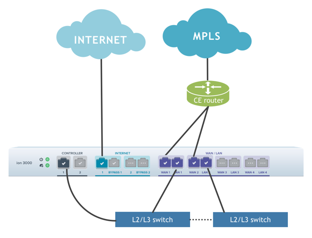 • Single Router or Dual Switch—The following image illustrates the deployment architecture of an ION 3000 as single router or dual switch.