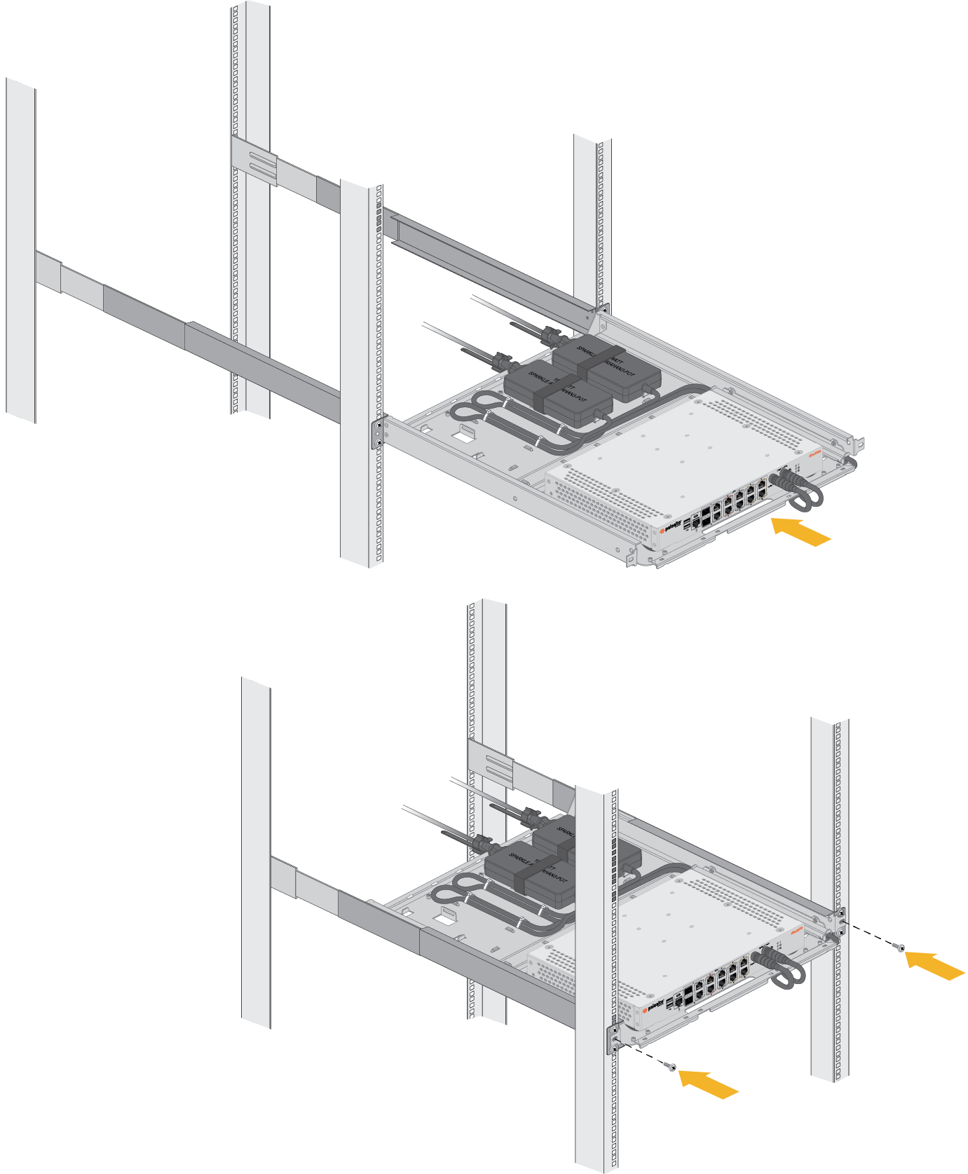 3. Secure the rails to the equipment frame with mounting screws (not provided) compatible with your equipment frame. Tighten the screws to their recommended torque value.