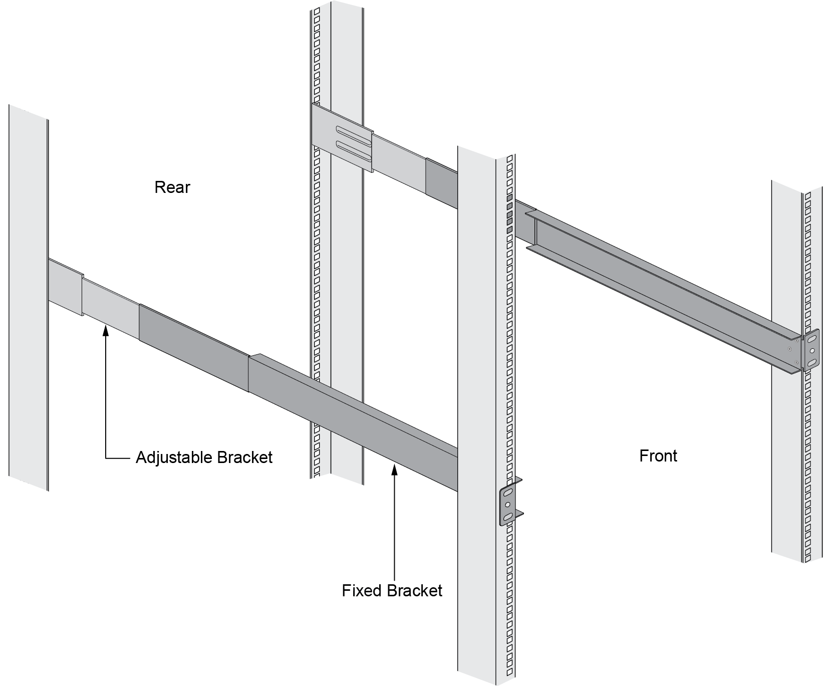 1. Slide one of the adjustable mounting brackets into one of the fixed mounting brackets to create a mounting rail. Repeat for the second mounting rail. The adjustable and fixed brackets are the same for the left and right side.