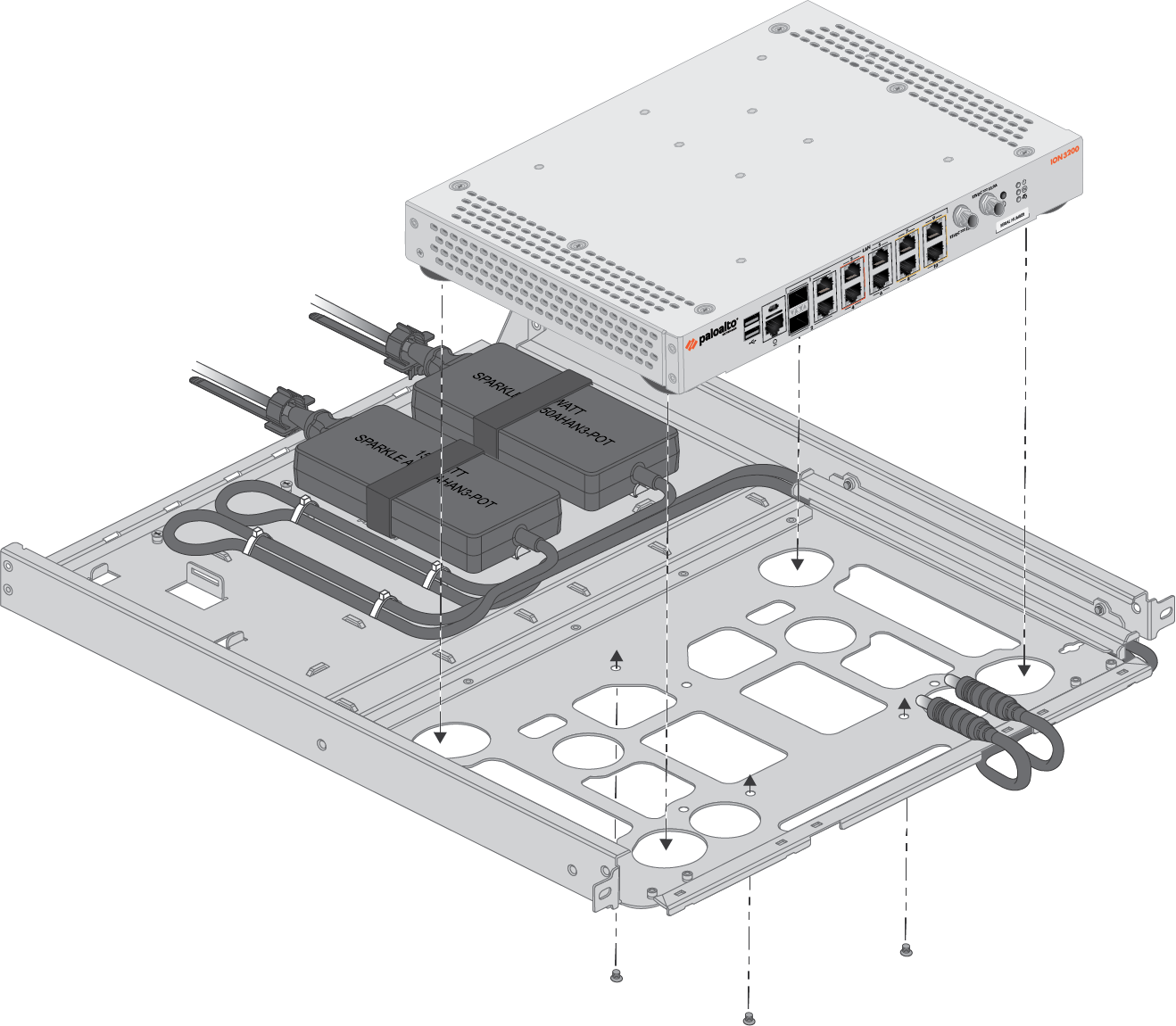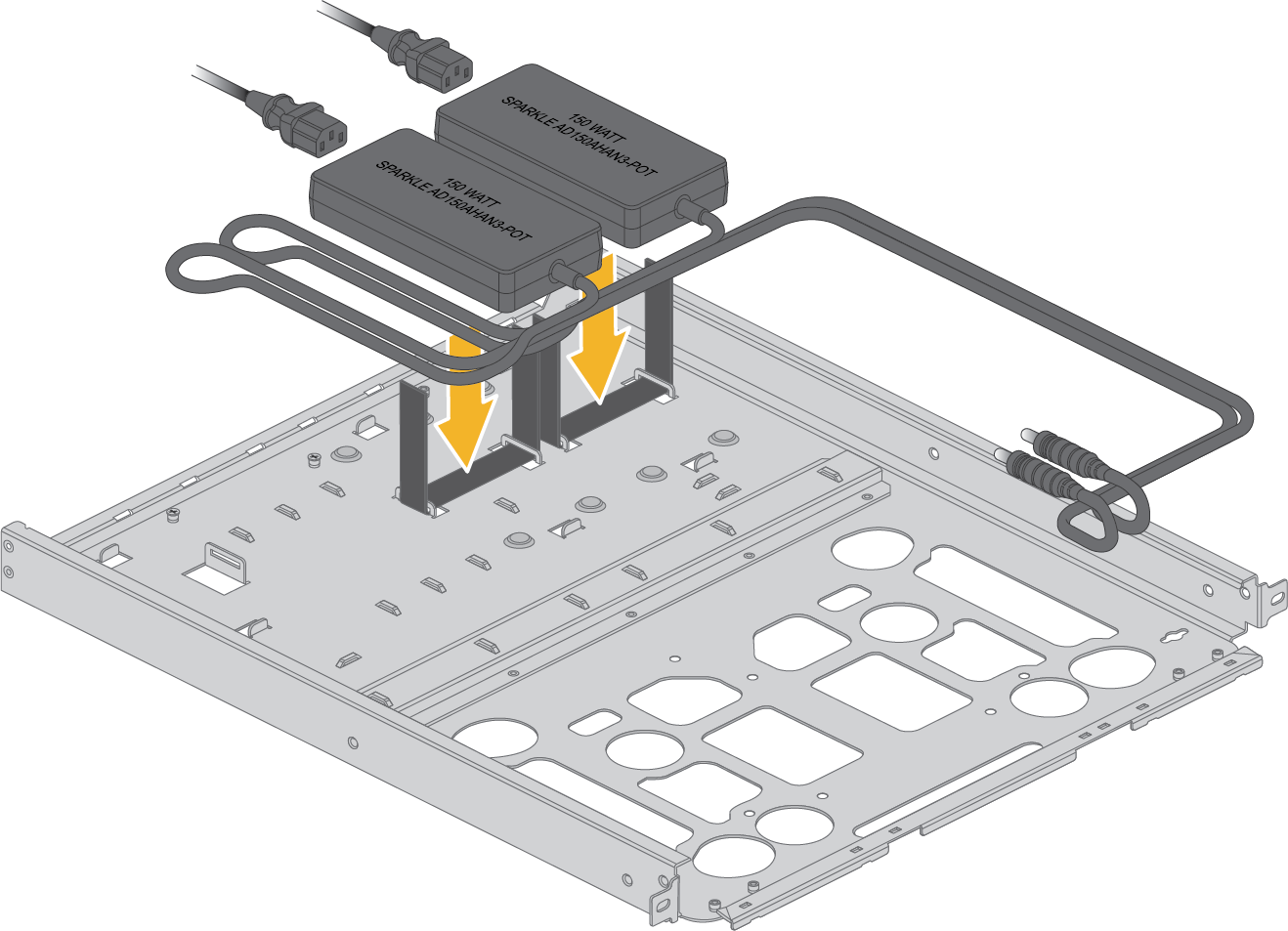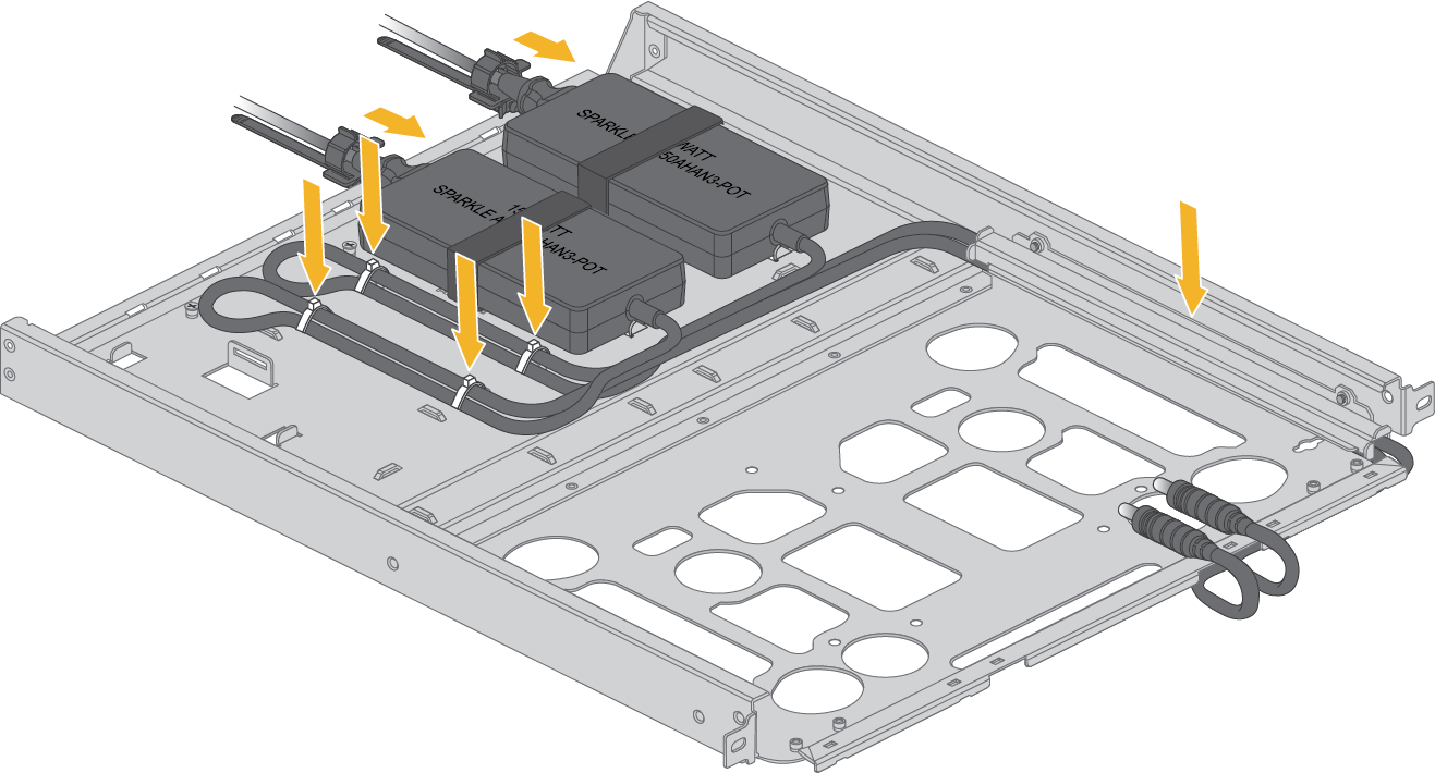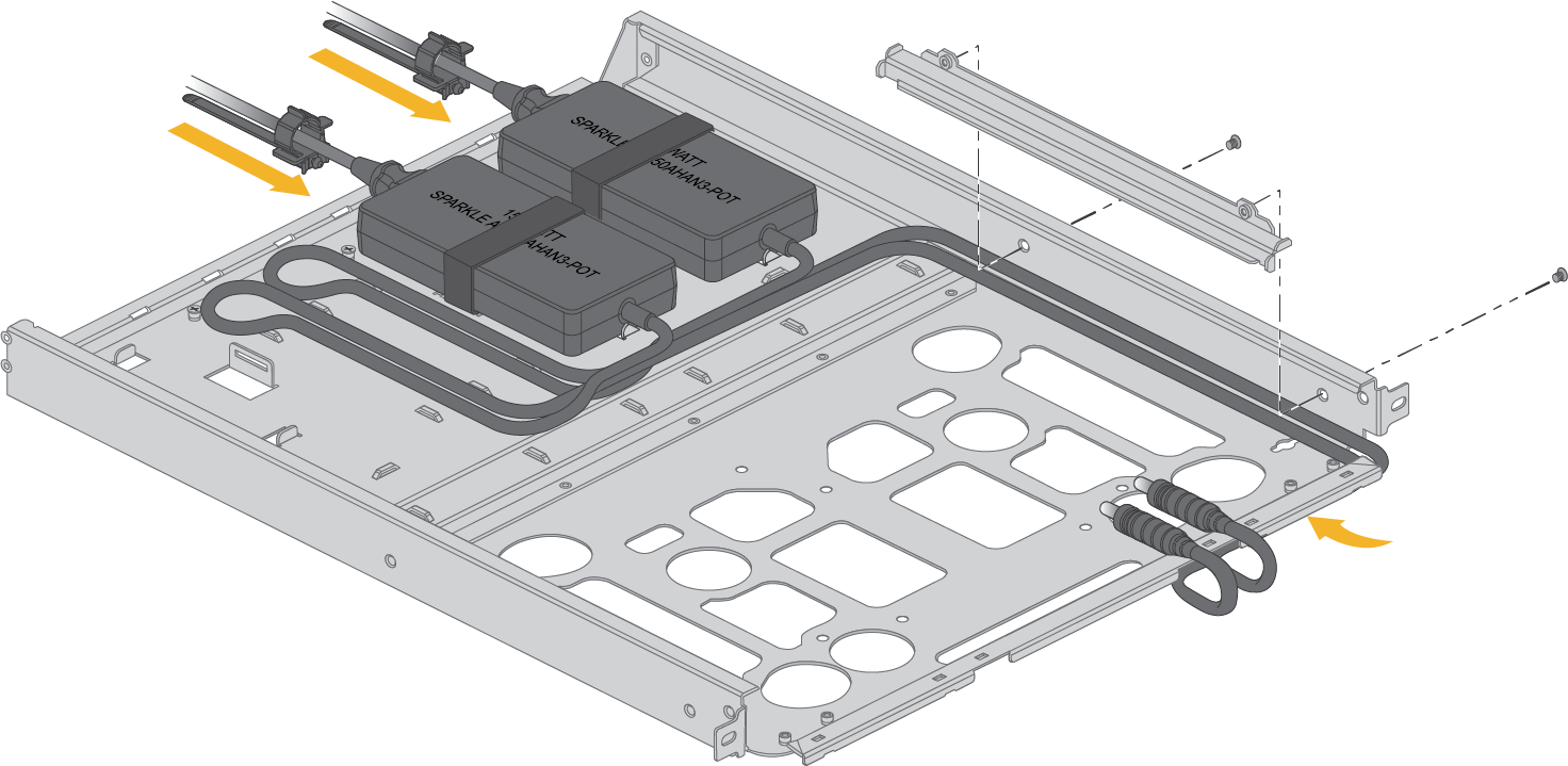 6. Plug the power supply connector into the back of the device. Using the provided tie-wraps, bind and secure the power supply cable toward the back end of the tray using the sheet-metal lances toward the center of the tray.