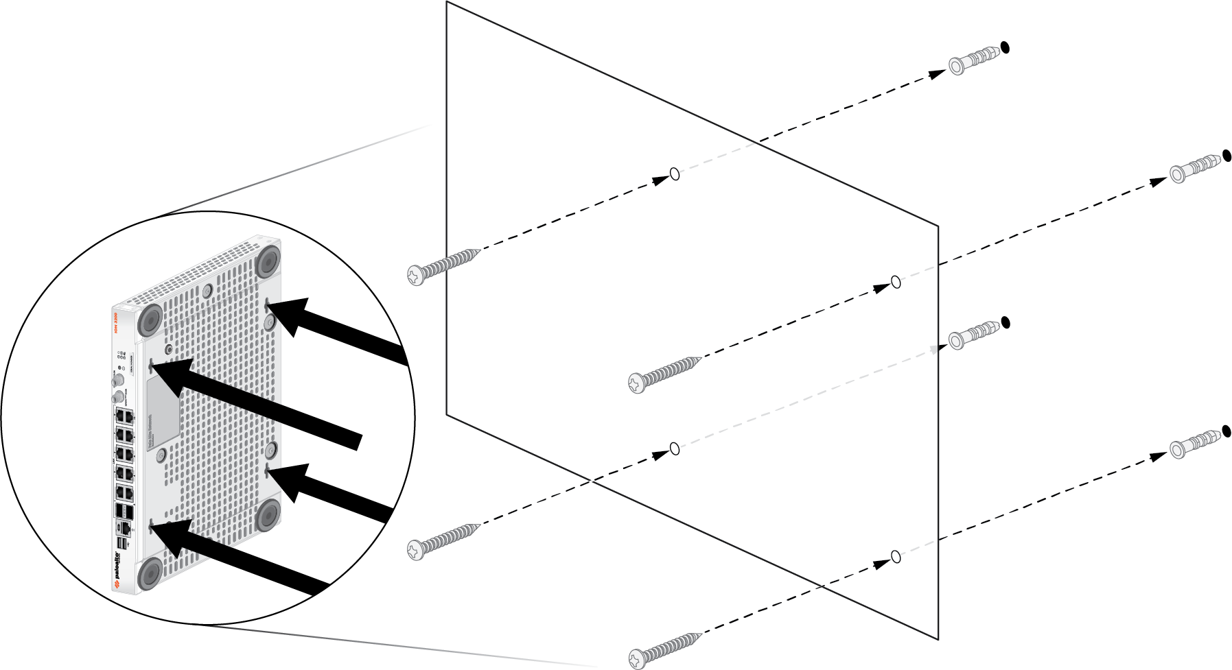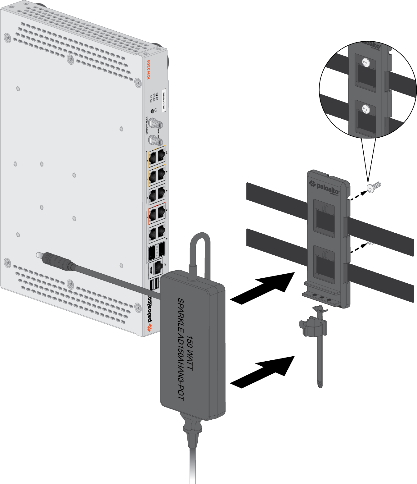 Screws and anchors are part of the wall-mount kit which is a separate kit option.Install the power adapter in the wall-mount bracket using the Velcro strap and cable tie. Make sure to align the cable tie with the notches in the bracket to prevent the power cord from falling out.After you secure the power adapter to the bracket, mount the bracket next to the device using wood or drywall screws as appropriate.