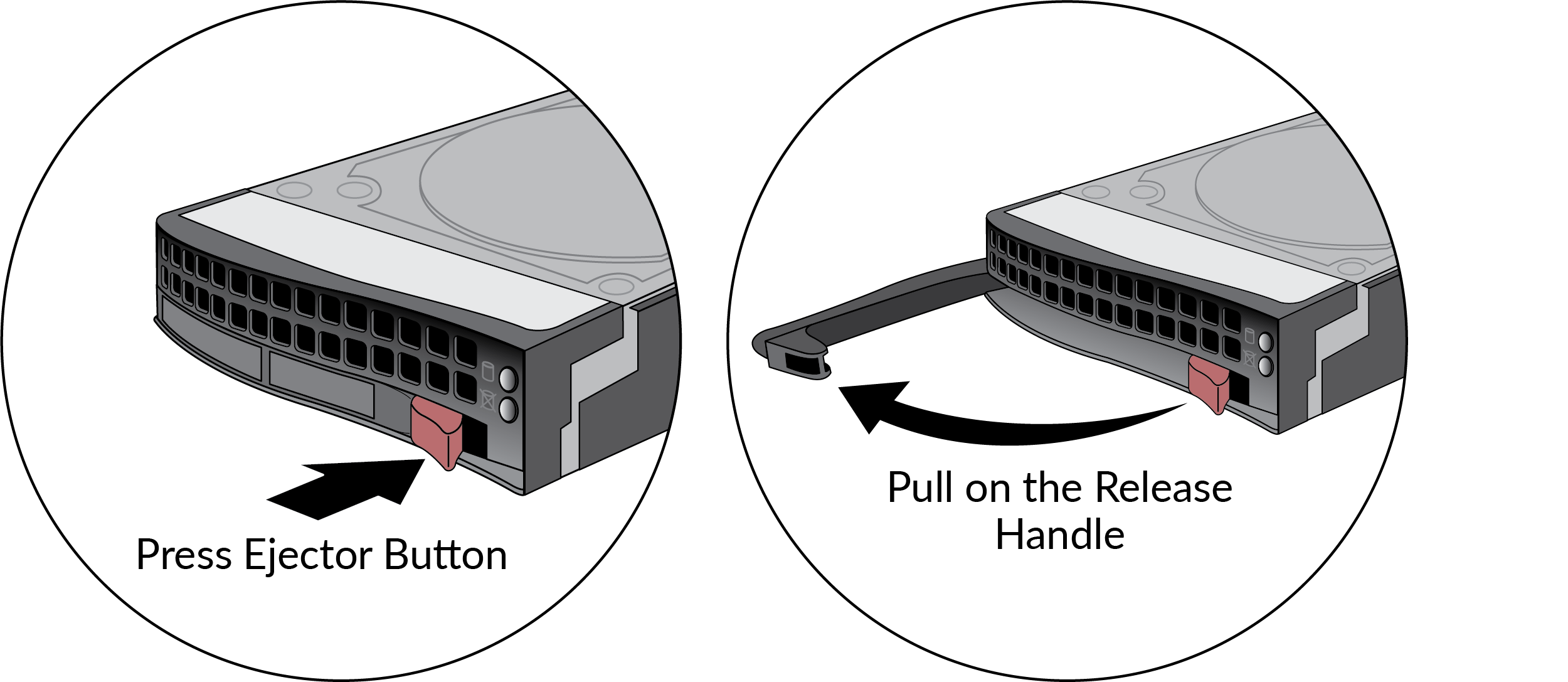 admin@hostname> request system raid remove A2- Press the ejector button on the carrier of the failed drive (A2 in this example) to release the carrier handle and gently pull the handle toward you and slide the carrier out of the appliance.