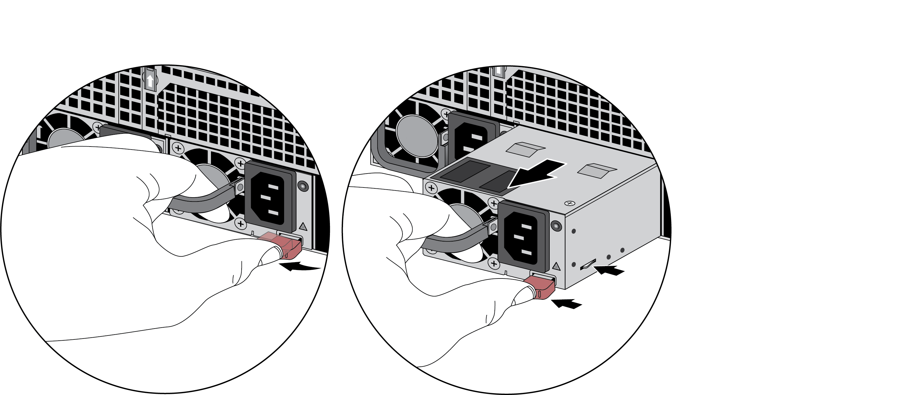 3. Grasp the handle on the failed power supply and simultaneously press the release lever to the left and then pull the power supply outward to remove it.