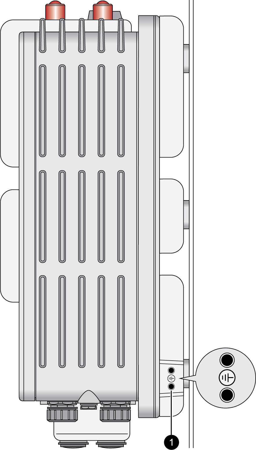 Connect one end of a 8 AWG ground cable (not included) to the provided dual-hole ground lug. Connect the other end of the cable to earth ground. Remove the two ground screws from the ground point on the side of the firewall. Hold the ground lug (that you previously attached to the ground cable) over the screw holes, and then attach the screws to secure the cable to the firewall.