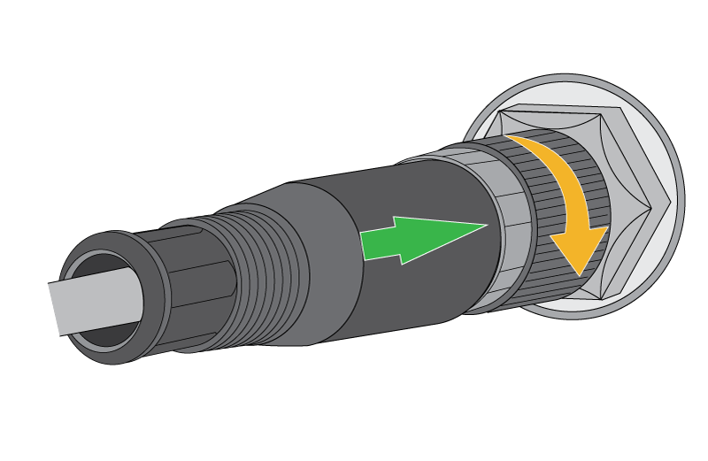 Secure the housing to the connector. Slide the clamping seal into the bottom part of the housing, then slide the clamping nut over the clamping seal. Tighten the clamping nut to the housing.