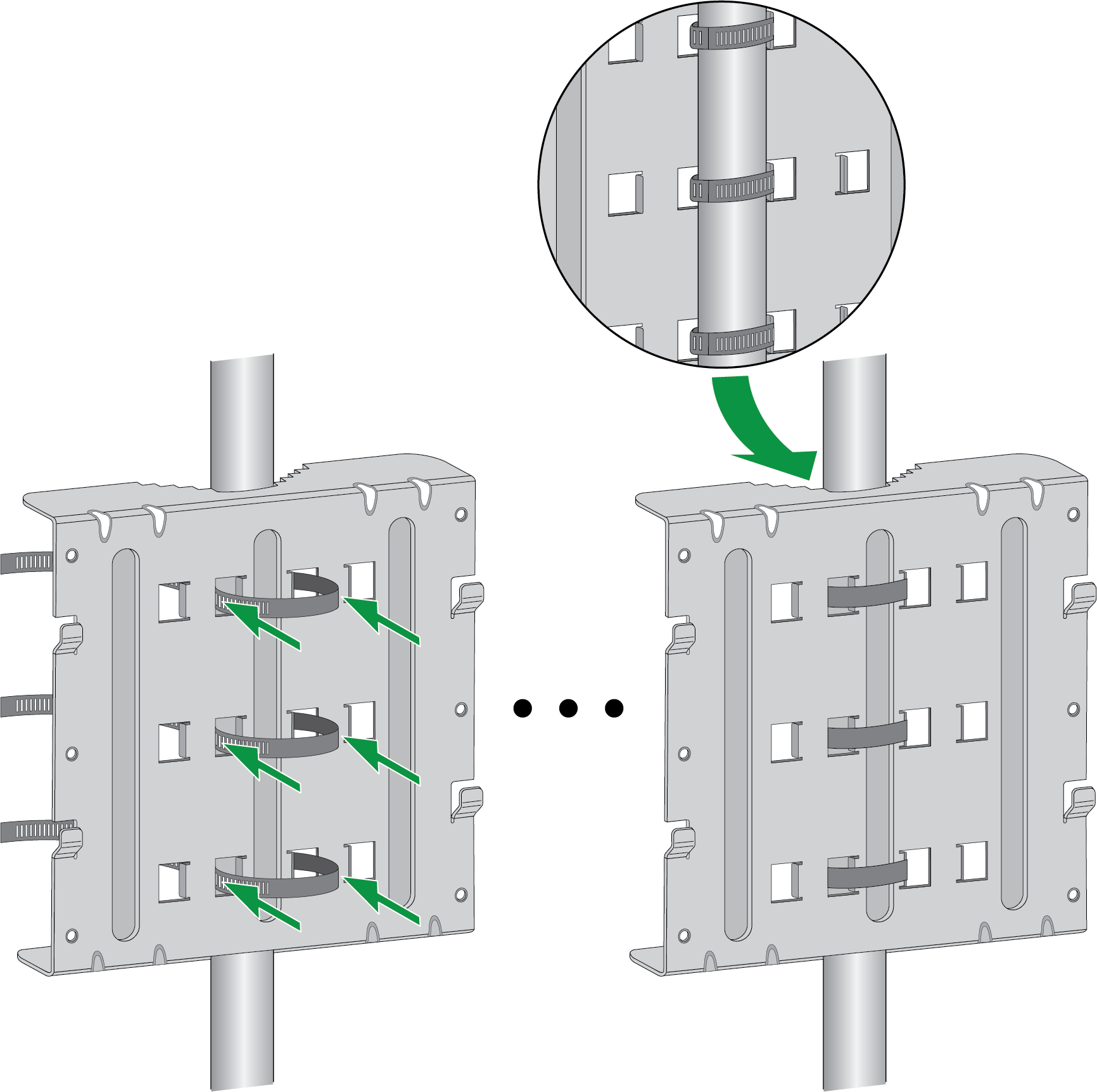 - Thread three of the provided straps through the slots on one side of the pole mount bracket. The slots that you choose depends on the width of the pole you are installing the firewall onto.Place the pole mount bracket at the location on the pole where you intend to install the firewall. Ensure that the curved cuts on the bracket are pressed against the pole.Wrap the three straps around the pole and then thread them through the slots on the opposite side of the pole mount bracket. The strap tightening hardware should be accessible on the side of the pole away from the bracket. Tighten the straps securely to ensure that the pole mount bracket does not shift or slide.The straps should be tightened enough so that the firewall does not slip but not so tight that the pole mount bracket bends.